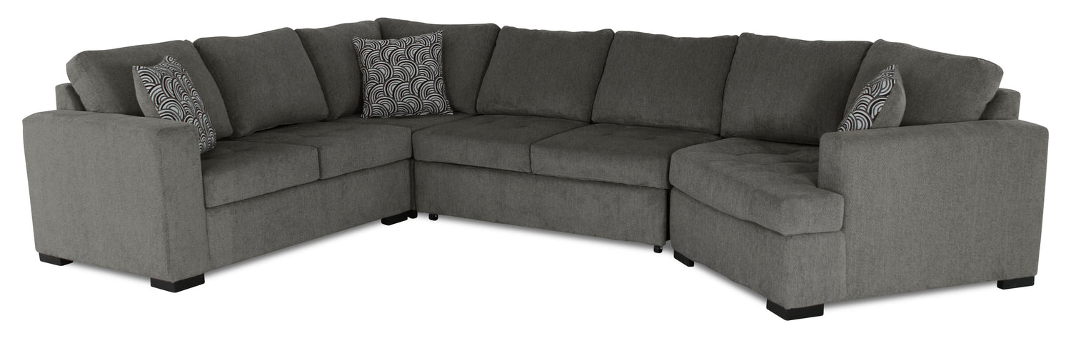 In a busy life, multipurpose furniture can make everyday occurrences so much easier. Whether hosting overnight guests or a family movie night, this spacious Legend four-piece sectional can do it all in style. With a calm, contemporary design and a rich pewter colour, this sofa will add a sense of comfort to your home. Chenille fabric is soft, and the extra padding provides comfort and support. Plus, the cuddler component adds a unique flair while allowing you to curl up with a loved one. Pull out the sleeper, get cozy and let comfort wash over you and your family with the Legend cuddler sectional.