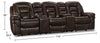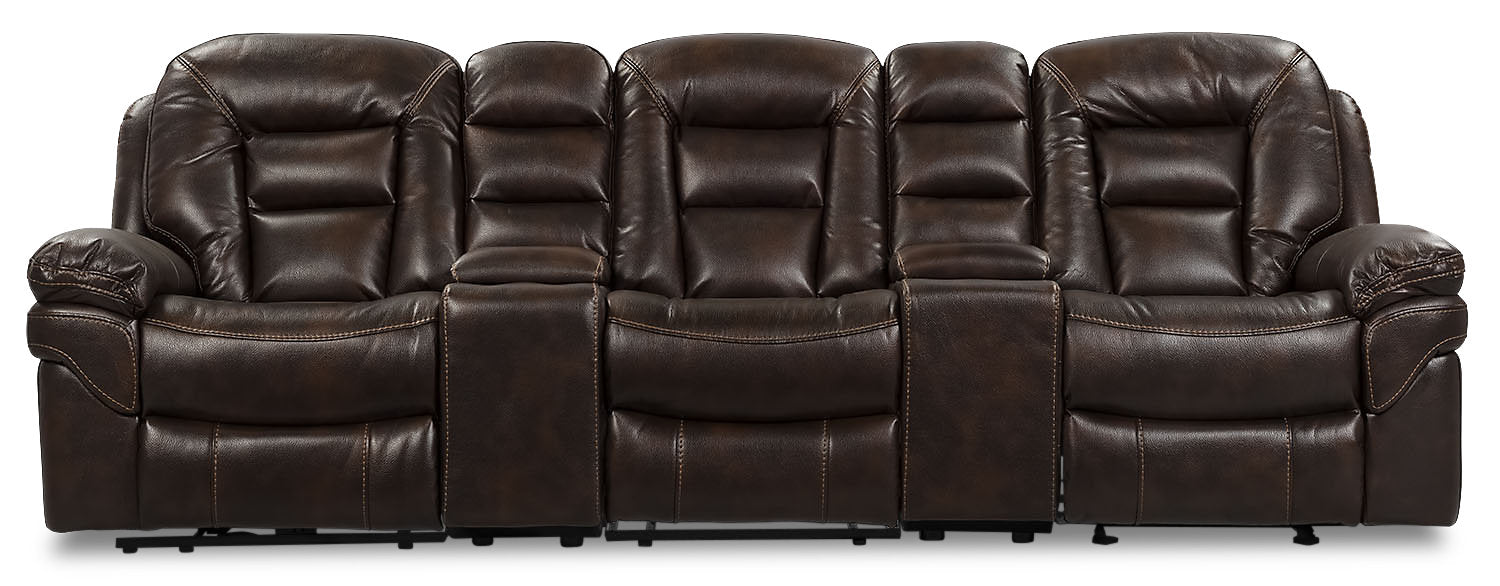 Create a warm and welcoming setting for your family with this plush, five-piece Leo power reclining home theatre sectional. Swathed in Leath-Aire upholstery, this revolutionary leather-look fabric adds a stylish look to your home while remaining breathable. Each cushion is filled with high-density foam to provide a cozy space to unwind. Meanwhile, multiple seats recline so you can choose where to stretch out at the end of a long day. Get comfortable on this Leo Leath-Aire home theatre sectional.
