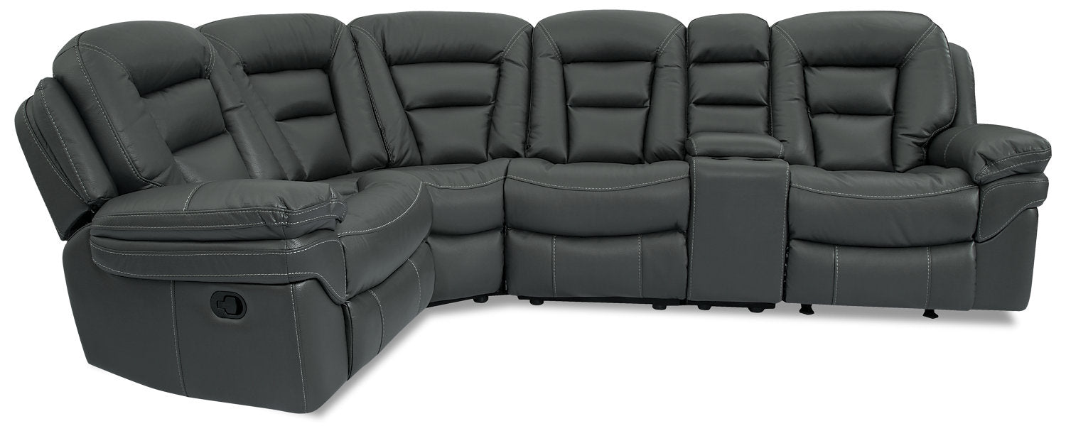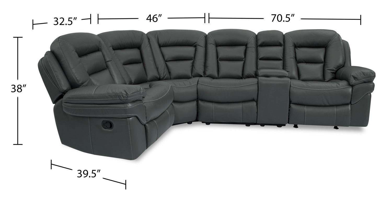Create a warm and welcoming setting for your family with this plush, five-piece Leo reclining sectional with console. Swathed in Leath-Aire upholstery, this revolutionary leather-like fabric adds a stylish look to your home while remaining breathable. Each cushion is filled with high-density foam to provide a cozy space to unwind. Meanwhile, multiple seats recline so you can stretch out at the end of a long day. Get comfortable on this Leo Leath-Aire sectional.