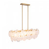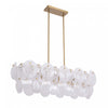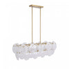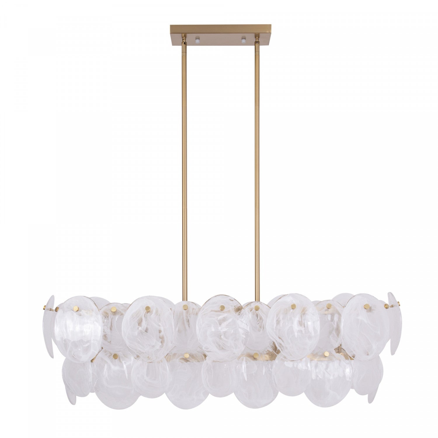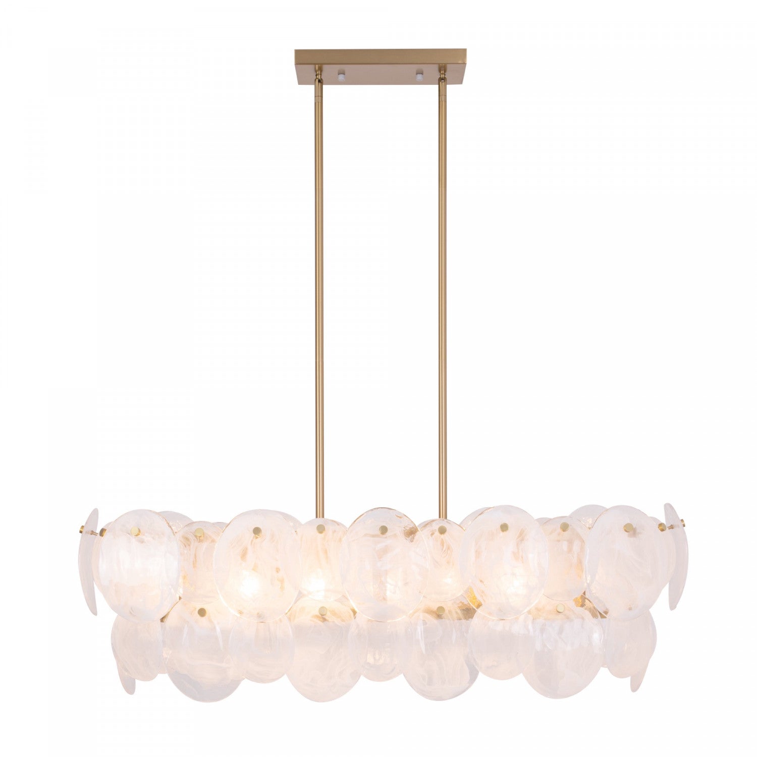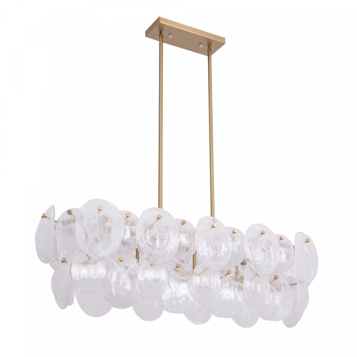 The lily collection exudes a delicate charm, captivating with its murano-style glasswork in a wispy white finish. Each circular panel dances with subtle elegance, reflecting light in a manner that feels both luxurious and inviting. Complemented by a brushed brass frame, the design radiates a poetic blend of elegance and allure. This chandelier casts a spell of enchantment, illuminating your space with a touch of dreamy opulence.