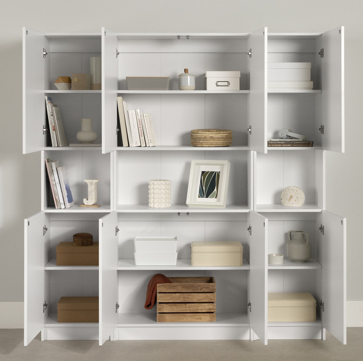 Elegant modules. This set of 3 bookcases creates a fine blend of simplicity and functionality. Inspired by contemporary design, each piece of furniture in this collection is refined, thanks to its handleless doors and open compartment in the center. Showcasing your favorite decorative accessories, photos and knick-knacks has never been easier. In all, this set includes 6 removable shelves that can be moved at will, supporting up to 25 lb. Push-to-open doors make it easy for the whole family to use. A versatile storage solution moving or changing decor? These 3 shelving units have been designed to follow you through every stage of life. Each unit can be used on its own or placed side by side. These bookcases also make full use of the wall, freeing up the floor for better floor usage.