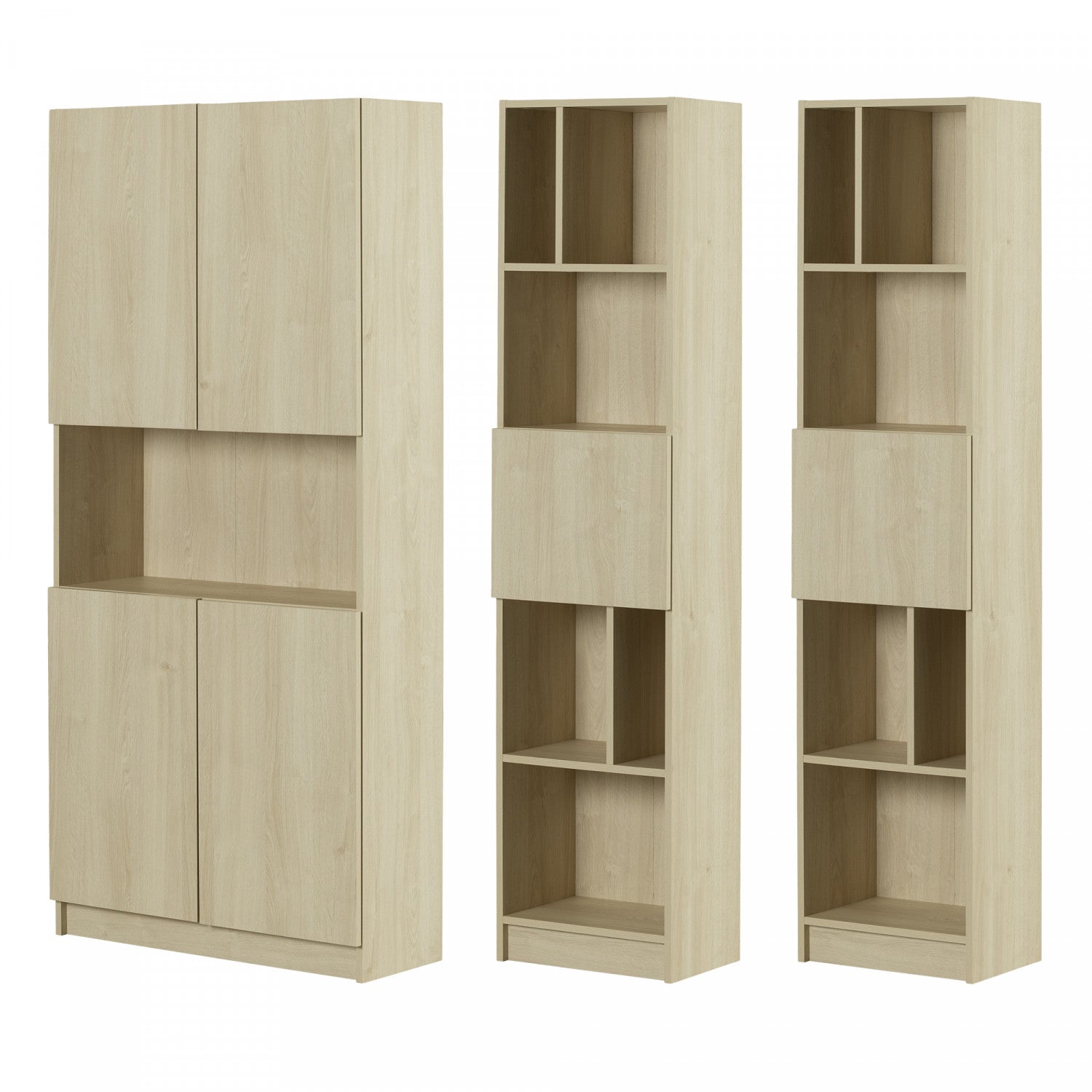 Optimize vertical space. De-cluttering your space is child's play with this set of modular bookcases. Don't let clutter get the better of you! Install these shelves in your living room to organize the kids' toys, books and magazines without wasting floor space. Open compartments let your decorative objects shine through, giving your space a contemporary feel. A complete set with modern style the main bookcase, slightly wider than the other 2, hides 2 adjustable shelves behind its 4 handleless doors. The 2 narrow shelves, meanwhile, offer up to 6 configurations in terms of division and door orientation. Using the smart push-to-open mechanism, open the doors with a simple press. The straight, clean cut of this set of shelving units will create a harmonious ambience.