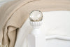 | Accent Details | A panel of white faux leather with tufted crystal buttons decorates the headboard. Crystal orbs and carved wooden roses adorn the tops of the headboard and footboard. |