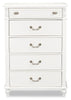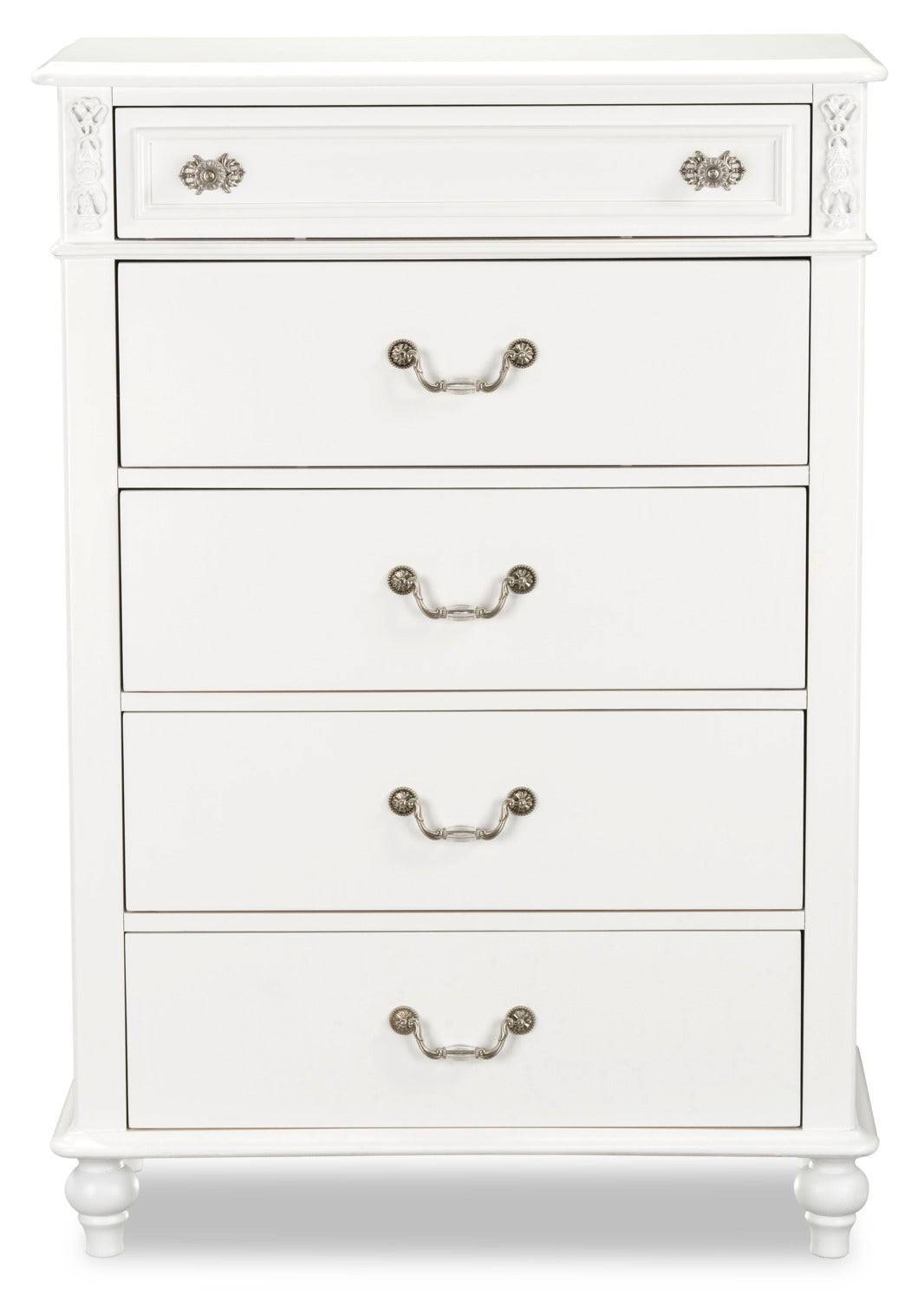 Show off your inner majesty with this Livy chest. This traditional curved design features turned feet and delightfully carved roses, all in a classic white finish. Each of the five spacious drawers is fronted by nickel pulls with crystal accents, perfect for adding some flair to your bedroom. A solid pine wood frame adds stability to keep your bedroom treasures tucked securely away. The Livy is a chest fit for royalty, and ready to add some serious sparkle to your regal bedroom.
