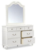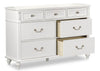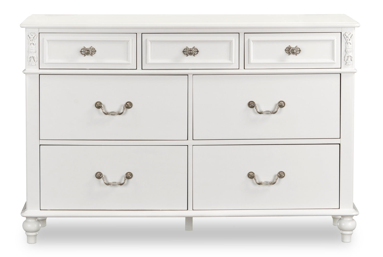 Show off your inner majesty with this Livy dresser. This traditional curved design features turned feet and delightfully carved roses, all in a classic white finish. Each of the seven spacious drawers is fronted by nickel pulls with crystal accents, perfect for adding some flair to your bedroom. A solid pine wood frame adds stability to keep your bedroom treasures tucked securely away. The Livy is a dresser fit for royalty, and ready to add some serious sparkle to your regal bedroom.