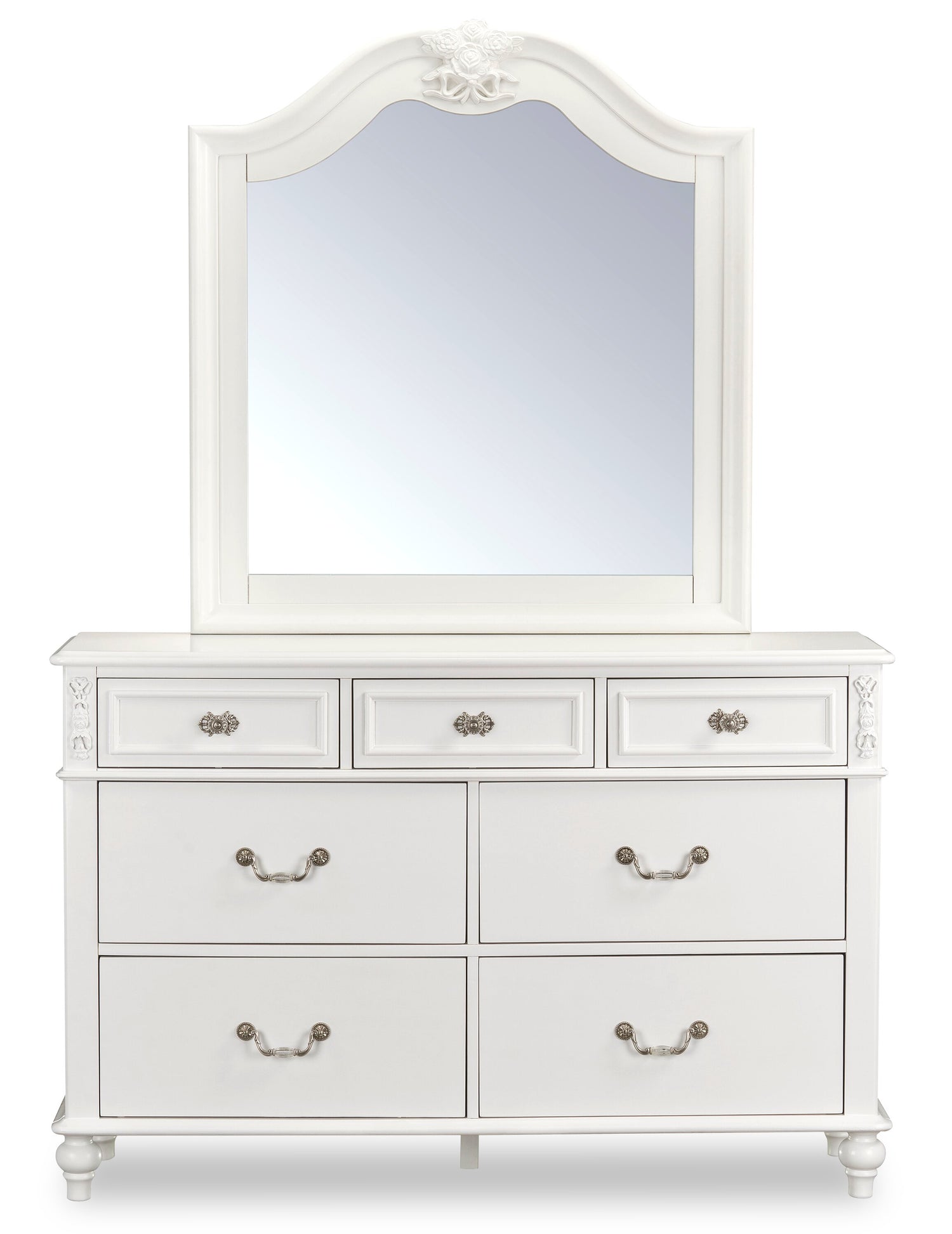 | Accent Details | Carved rose designs adorn the top of the dresser. |