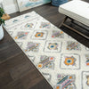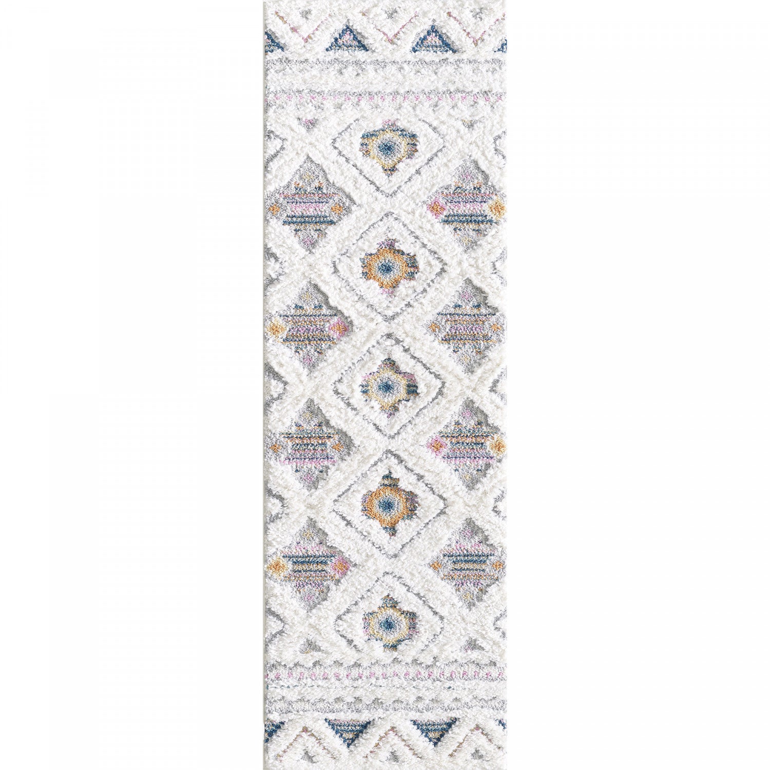 This beautiful shag area rug features an exquisite Bohemian diamond design and a mixed off white and grey cut-loop pile.