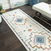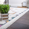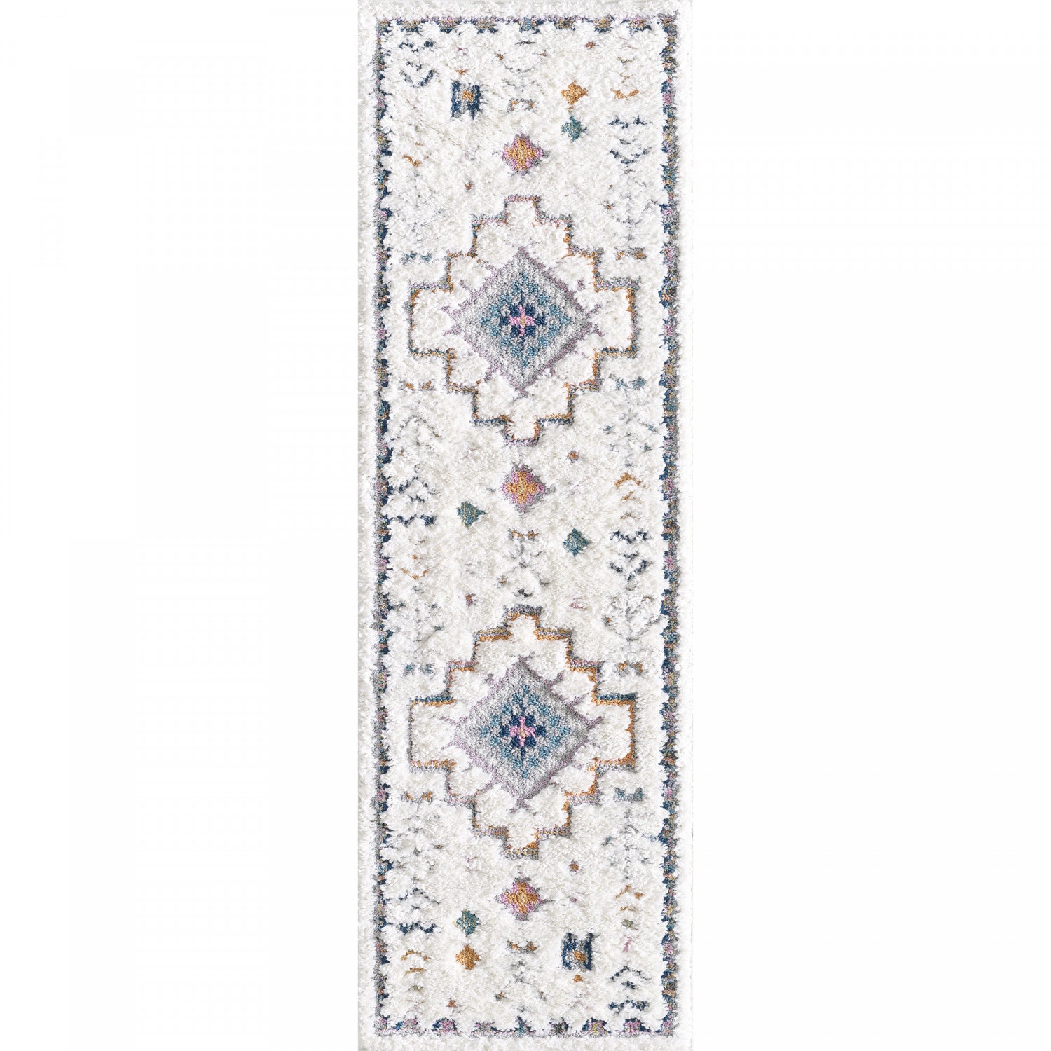 This beautiful shag area rug features an exquisite geometric design and a mixed and colourful cut-loop pile.