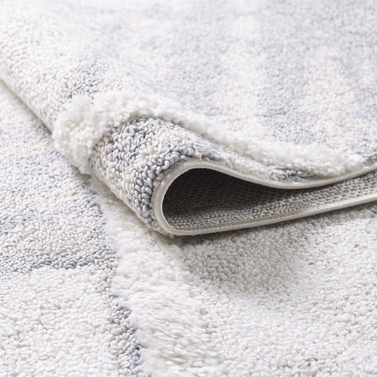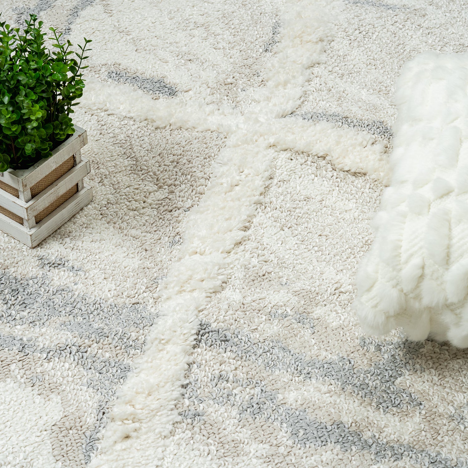 This beautiful shag area rug features an exquisite Lattice Moroccan design with a Cream and Grey pile.