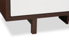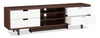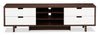 The glossy white of the drawers provides the perfect modern contrast against the dark walnut of the TV stand's frame.