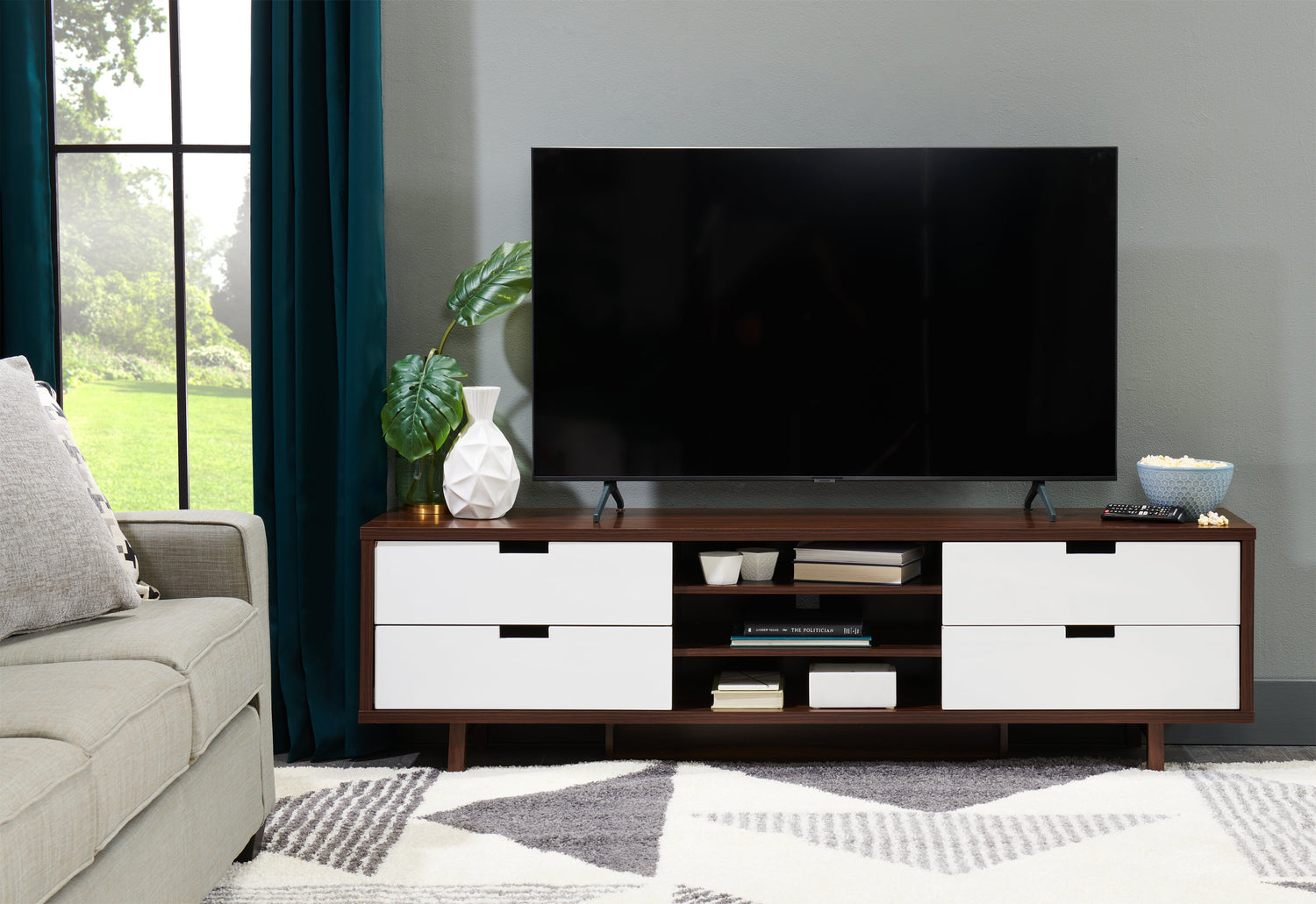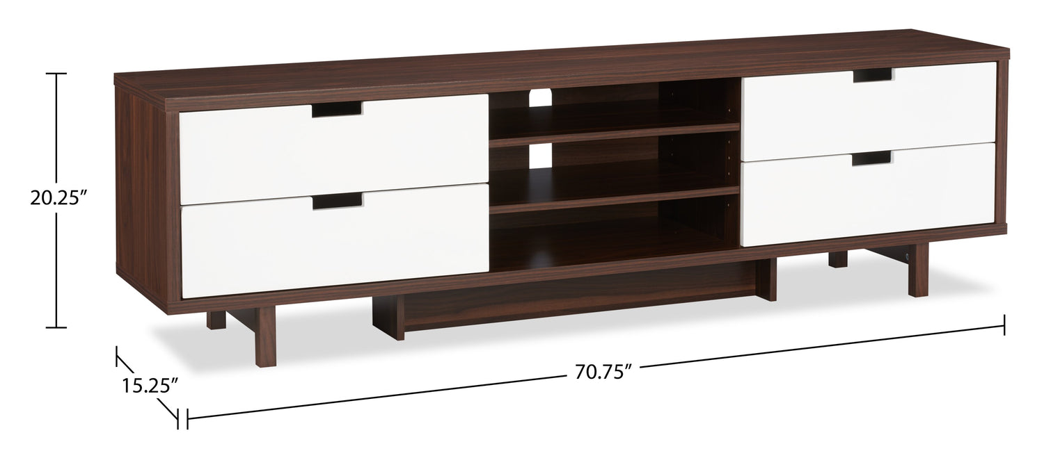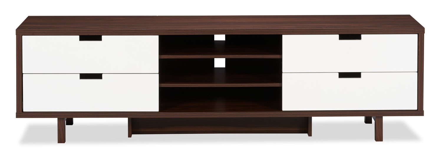 If you love the look of contrasting colours, this Lovran TV stand is sure to be your match. Glossy white drawers look striking against the dark walnut colour of the stand's frame. But style doesn't need to come at the price of function. Four large drawers provide plenty of room for your media accessories, while open shelving lets you display your favourite decor alongside your PVR. Plus, this 71-inch stand supports even the biggest televisions so you can fully immerse yourself in movie night.