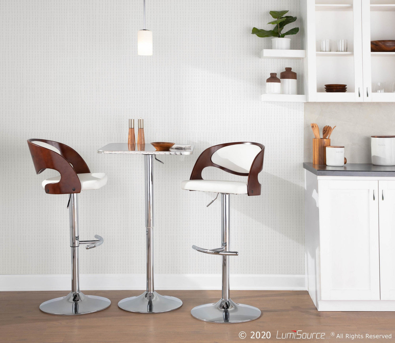 A decorative swirl pattern on an aluminum top makes the Bistro Bar Table perfect for multiple uses. A hydraulic lever allows the table top height to adjust from 26" to 41". With the adjustable chrome base you have a table perfect for smaller kitchens, dining areas or any bar. The new and improved Bistro Tables now feature tool-less assembly. Add it to your rec room, dining room, party, extra breakfast nook.