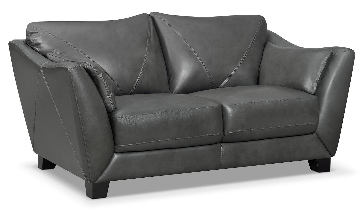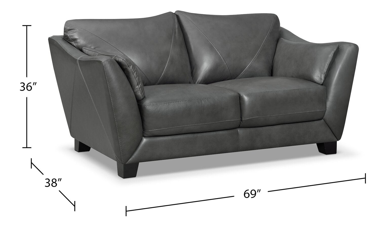 Take a seat on this elegant Lusso genuine leather loveseat, and experience true luxury in your own home. Each seat and back cushion is teeming with thick and comforting high-density foam, allowing you to truly relax on the deep seats after a long day. Made with grey leather, the seating area features V-shaped stitching to echo the angled loveseat arms. Plus, the solid wood and engineered hardwood frame provides a reliable base for entertaining your guests.