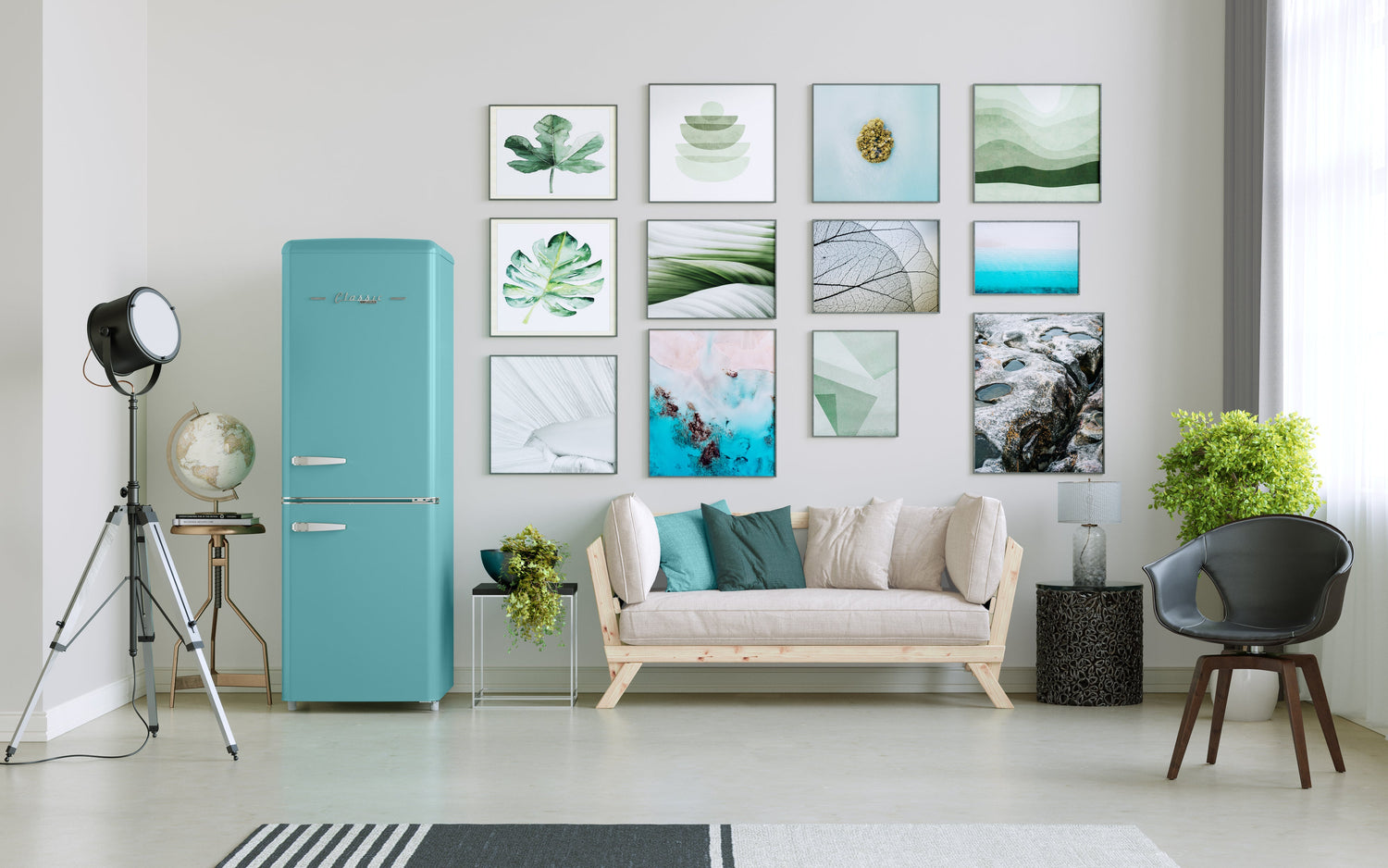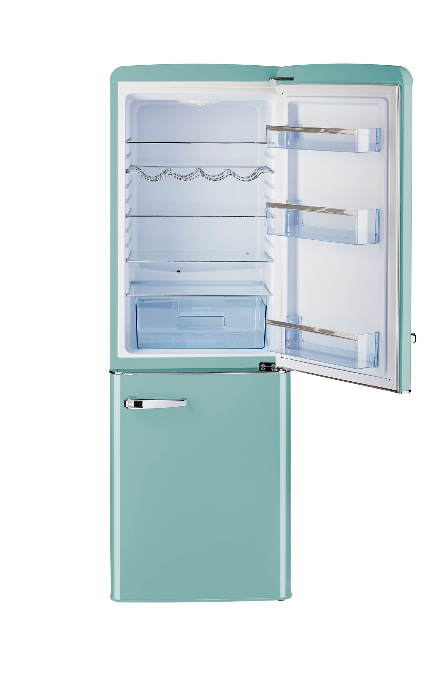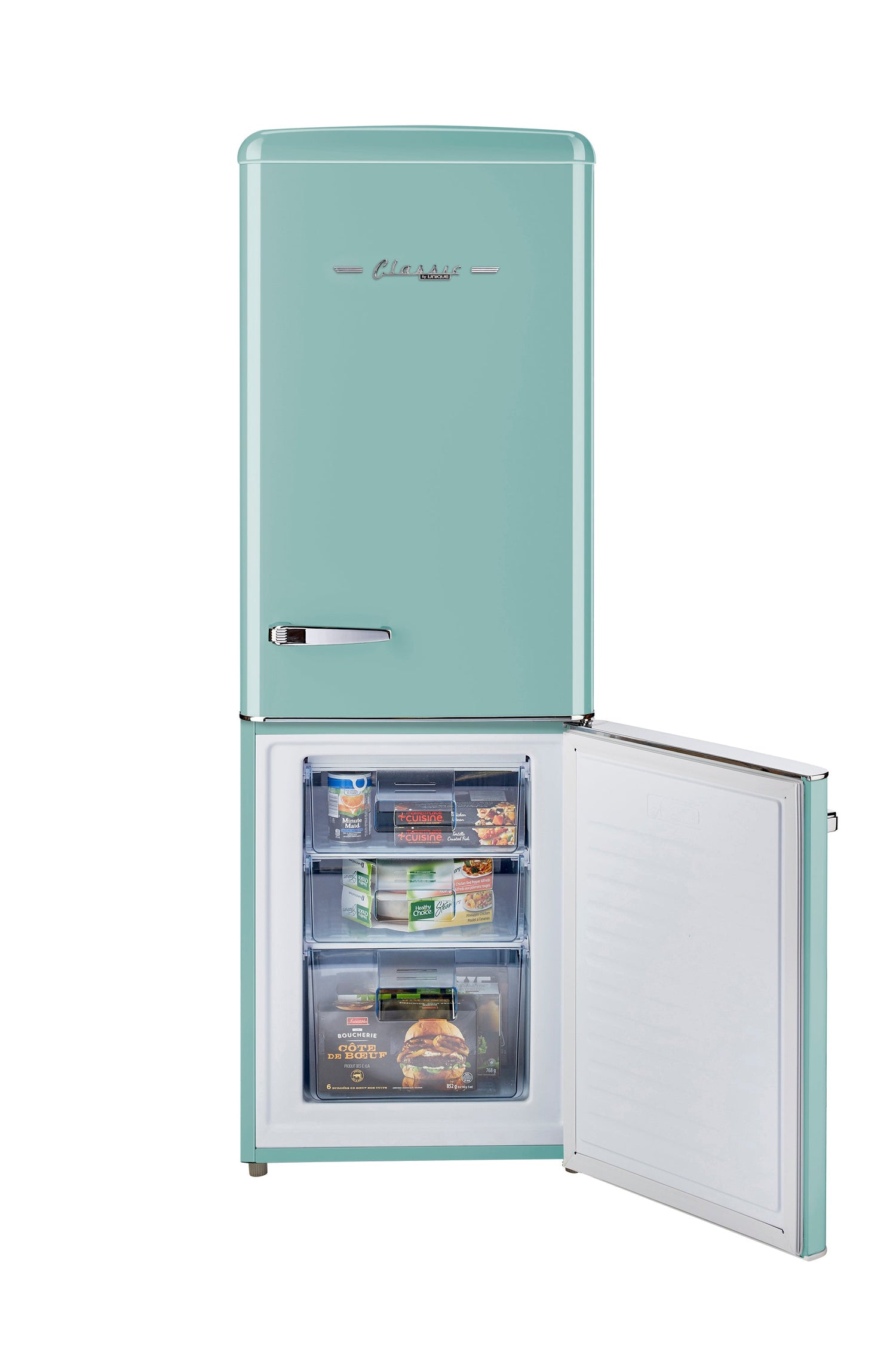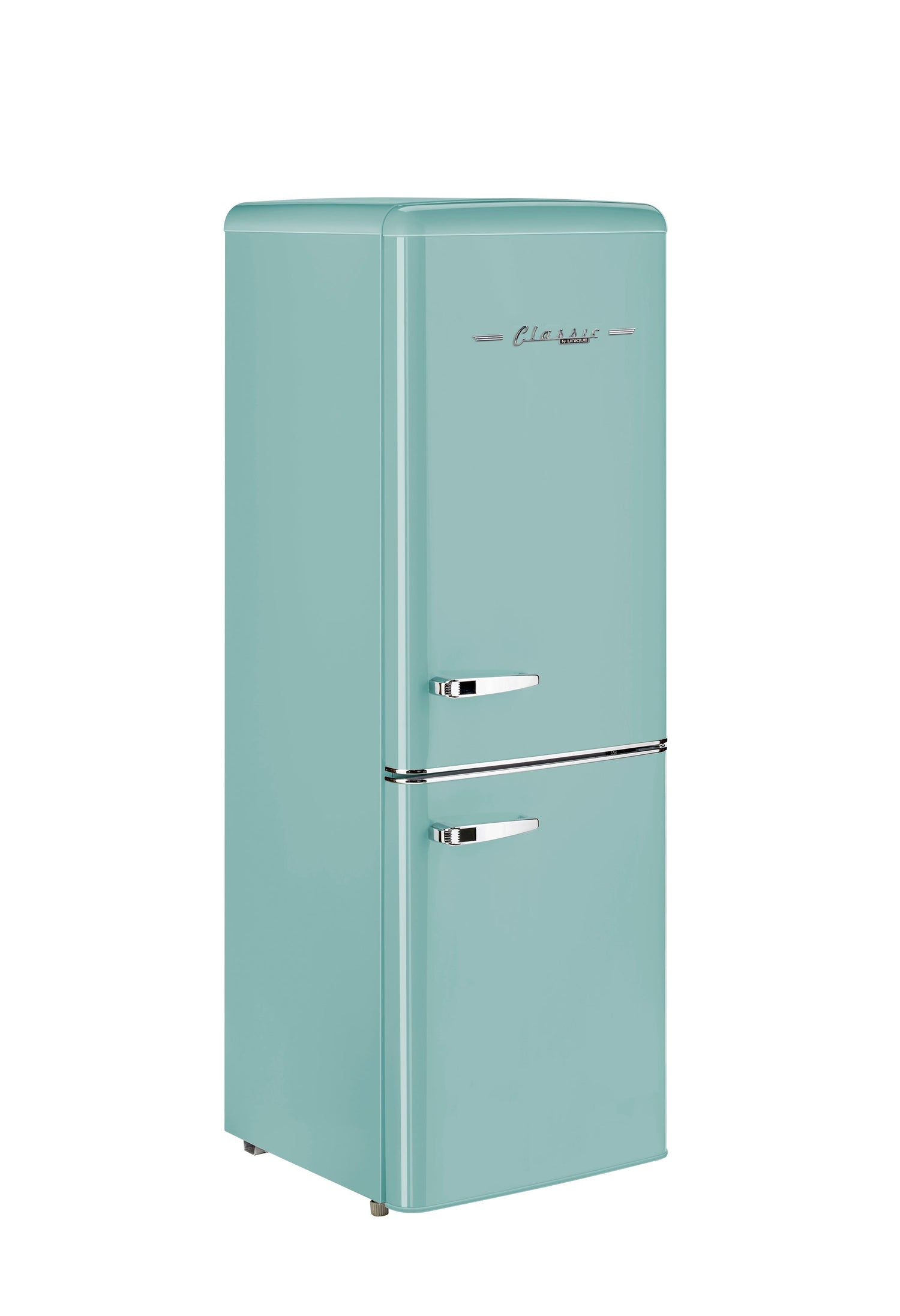 Unique's 7 cubic-foot retro bottom mount refrigerator transports you back to the '50s with its iconic retro design and chrome-finished accents. This refrigerator is for energy efficiency all year-round, designed for optimal energy savings and easy, dependable use. Storing your fresh and frozen foods is easy with its convenient fridge on top and freezer on the bottom design. Convenient storage options and simple effortless controls all packed into a stylish retro design make this the perfect stand-out unit for your home, cottage or bar.