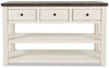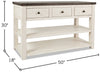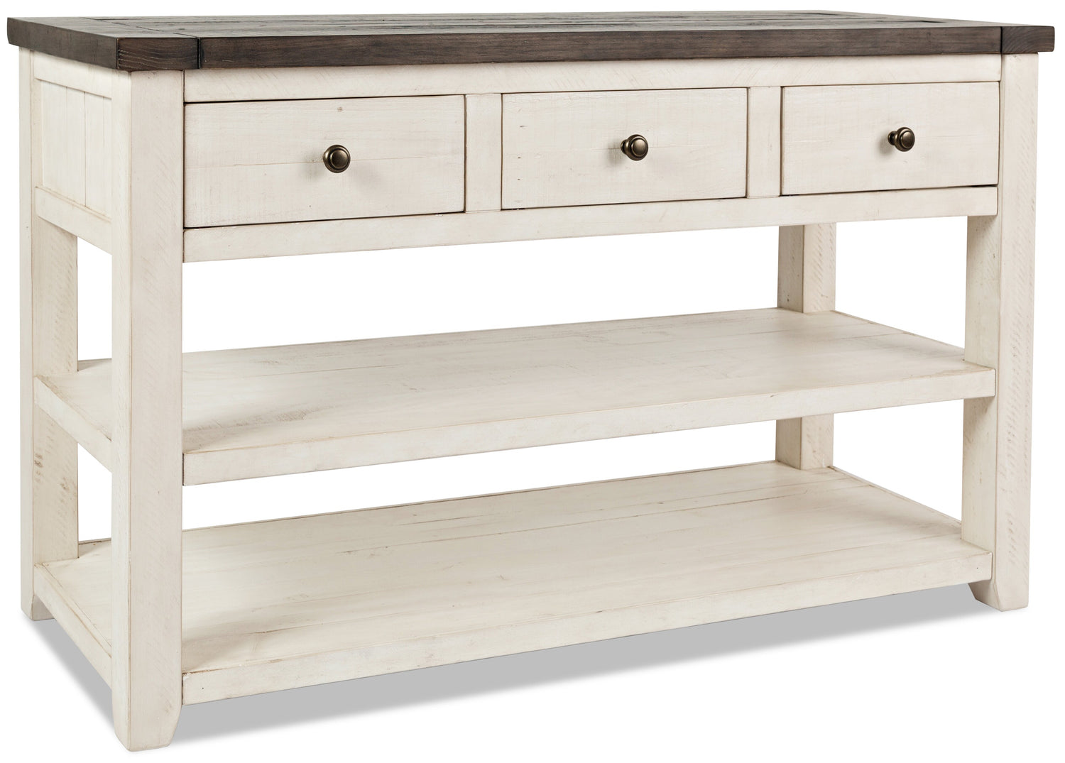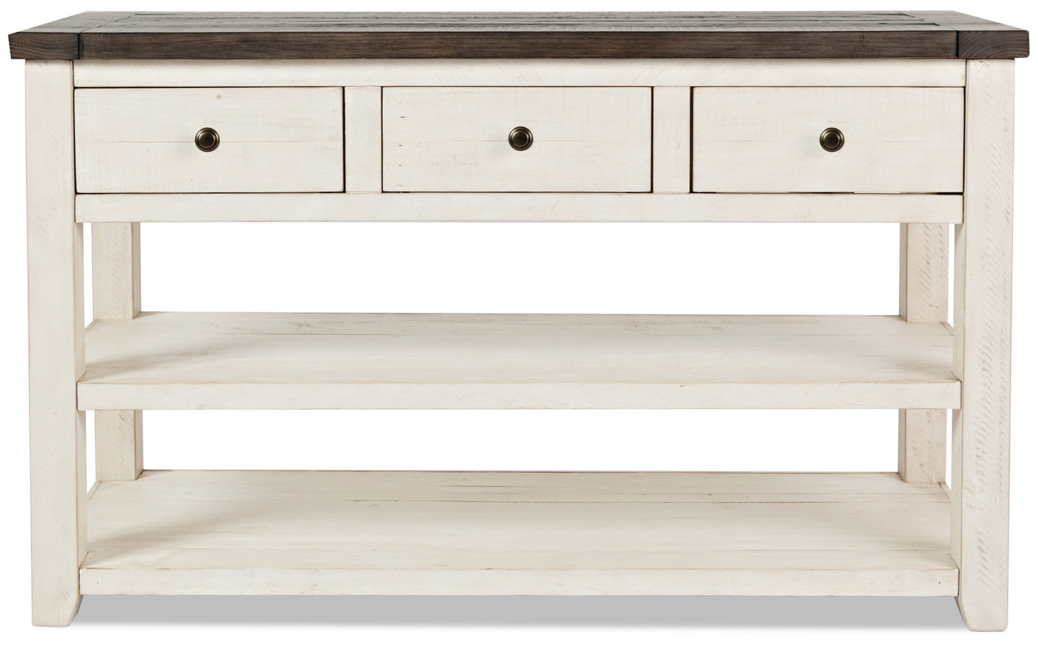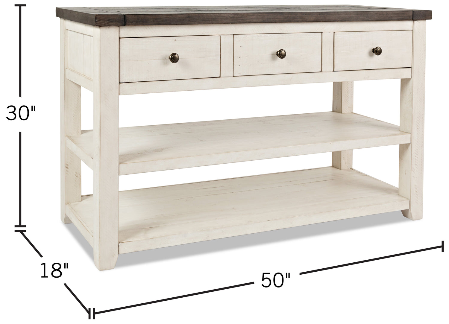 Boasting a stylish reclaimed wood look blended with old fashioned charm, this Madison sofa table is here to bring a hefty dose of rustic style to your home. Three deep drawers provide a place for mail, keys or serving accoutrements. Below the drawers, two large shelves lend extra space for books, speakers or home decor pieces. The sturdy reclaimed pine wood is lightly distressed for a chic, industrial vibe and is finished on all sides, so it looks good from any angle. Place this sofa table under a mirror or your favourite wall art for extra visual impact.