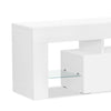 Add minimalist sophistication to your living room with this Maggie TV stand. With a high-end, glossy white laminate finish, sleek shelving space and durable construction, this entertainment centre is as practical as it is stunning. The top holds 70-inch TVs or smaller and the two drawers underneath are seamlessly integrated and provide ample storage. Tempered glass shelves on either side of the drawers provide a unique display area for your movies, collectables or anything else you want to display prominently.