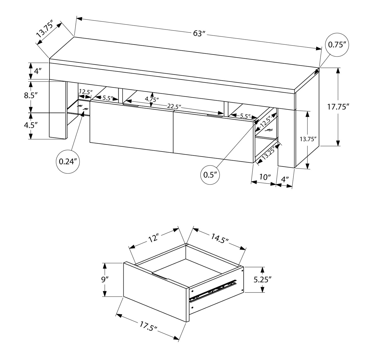 Width: 63" (160.0 cm) Height: 17.75" (45.1 cm) Depth: 13.75" (34.9 cm)