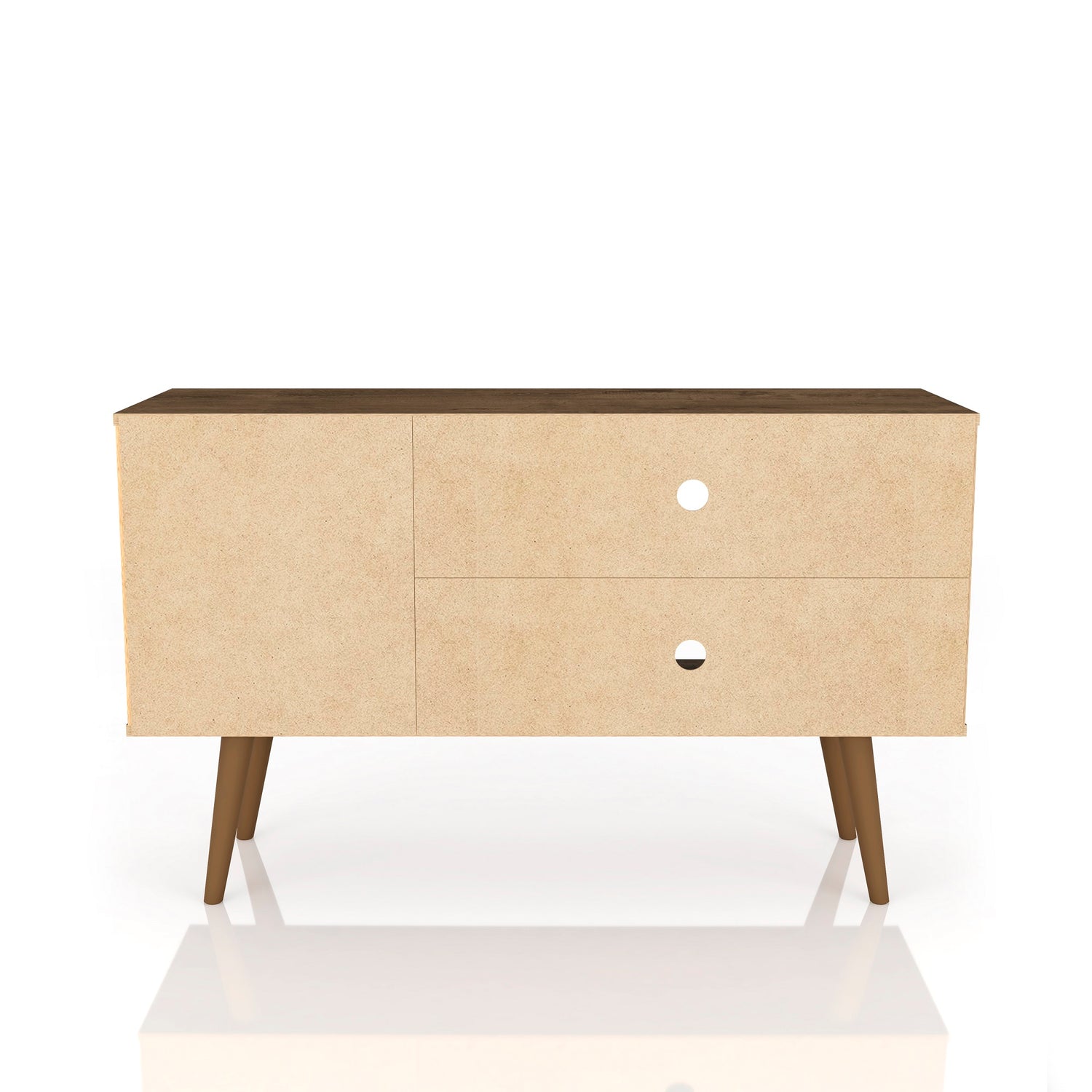 The Liberty 42.52 Mid-Century Modern TV Stand is the perfect blend of quality craftsmanship, brilliant design, and purposeful functionality. Featuring 2 open shelves, and one hidden cubby to create the ultimate entertainment center perfect for stashing DVDs, board games, electronics, and media accessories. Free standing and easy to maneuver, this piece will mix well with any decor and its artful grooves will create a statement in any space.