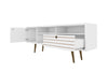 The Liberty 70.86 Mid-Century Modern TV Stand is mid-century modern at its best. Quality craftsmanship and careful detailing create the ultimate blend of style, functionality, and brilliant design. A sophisticated entertainment center, the piece features open shelving, as well as two hidden compartments perfect for stashing DVDs, board games, electronics, and media accessories. Free standing and easily moved, this stand will mix well with any decor and its artful grooves will create a statement in any space. Available in white, white and rustic brown, white and aqua blue, white and yellow, rustic brown, rustic brown and white, and rustic brown and yellow.