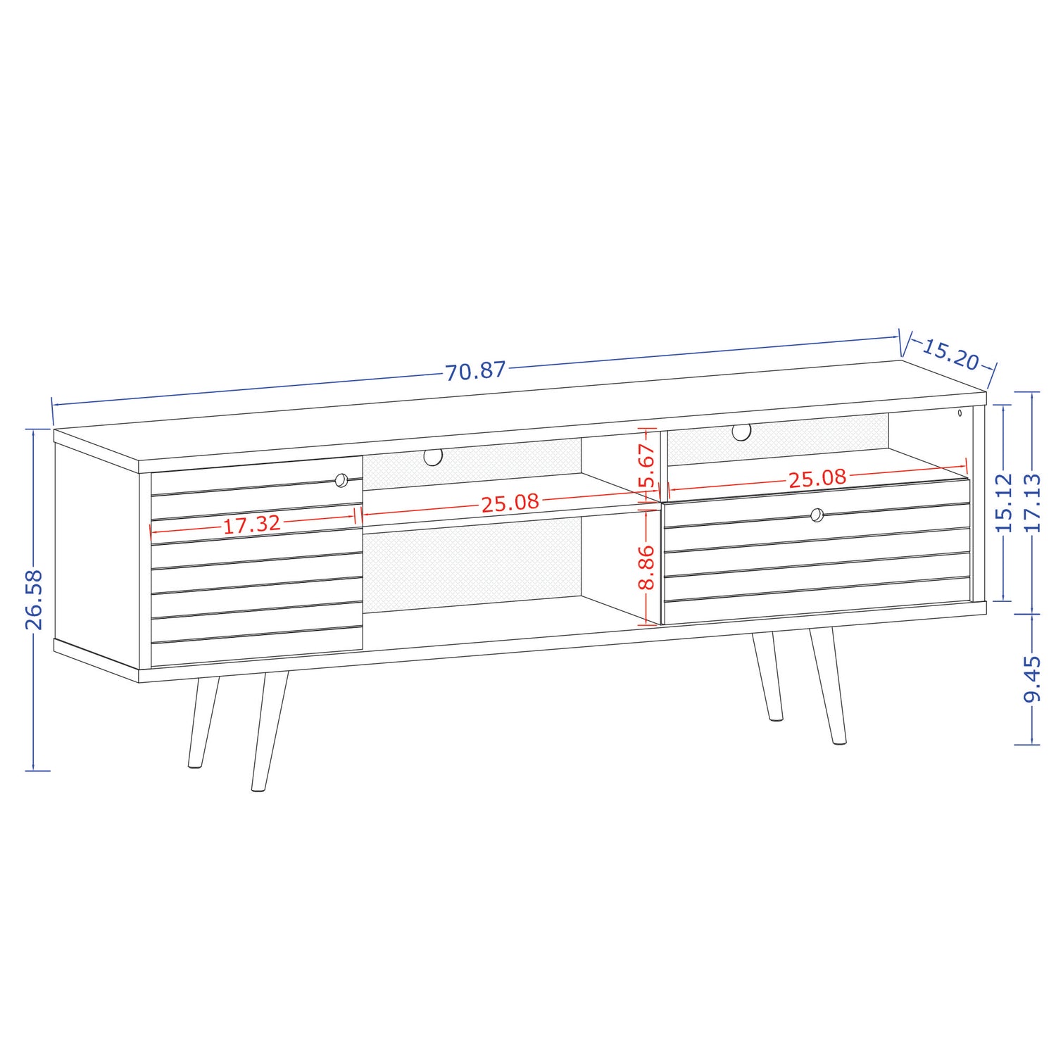 The Liberty 70.86 Mid-Century Modern TV Stand is mid-century modern at its best. Quality craftsmanship and careful detailing create the ultimate blend of style, functionality, and brilliant design. A sophisticated entertainment center, the piece features open shelving, as well as two hidden compartments perfect for stashing DVDs, board games, electronics, and media accessories. Free standing and easily moved, this stand will mix well with any decor and its artful grooves will create a statement in any space. Available in white, white and rustic brown, white and aqua blue, white and yellow, rustic brown, rustic brown and white, and rustic brown and yellow.