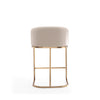 A hint of mid-century modern style that brings the chic and elegant flair to any home's decor. This stool is all kinds of wonderful. A clean-lined, curved, and comfortable seat, sits atop a shimmery gold semi-circle pedestal base. A metal footrest finishes the look, bringing added comfort to the leather-upholstered piece. Gorgeously well-served, in a perfect neutral tone for that touch of warm texture.