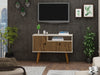 Part dresser, part living room entertainment focal point, the Tribeca TV stand is Mid-century modern at its best, and is as versatile as it is functional. This piece couples as a dresser and easily showcases your television, tucking away any media accessories in the concealed shelving space, while an open shelf perfectly fits a DVD player or laptop. In the bedroom or in the living room, stow throw blankets, clothing, or table linens, this piece goes easily from space to space and blends with existing decor to create a statement. Splayed legs and clean lines make for a seamless look.