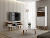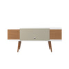 The Utopia 53.14 TV Stand melds quality craftsmanship, brilliant design, and modern functionality to create a seamlessly streamlined, and free standing entertainment center. Statement legs and corner open storage sections bring character to a space, while three airy shelves are perfect for storing all of your entertainment accessories. Available in off-white and maple cream and white gloss and maple cream.