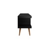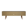 The Utopia 70.47 TV Stand melds quality craftsmanship, brilliant design, and modern functionality to create a seamlessly streamlined, and free standing entertainment center. Statement legs and corner open storage sections bring character to a space, while three airy shelves are perfect for storing all of your entertainment accessories. Available in off-white and maple cream and white gloss and maple cream.