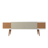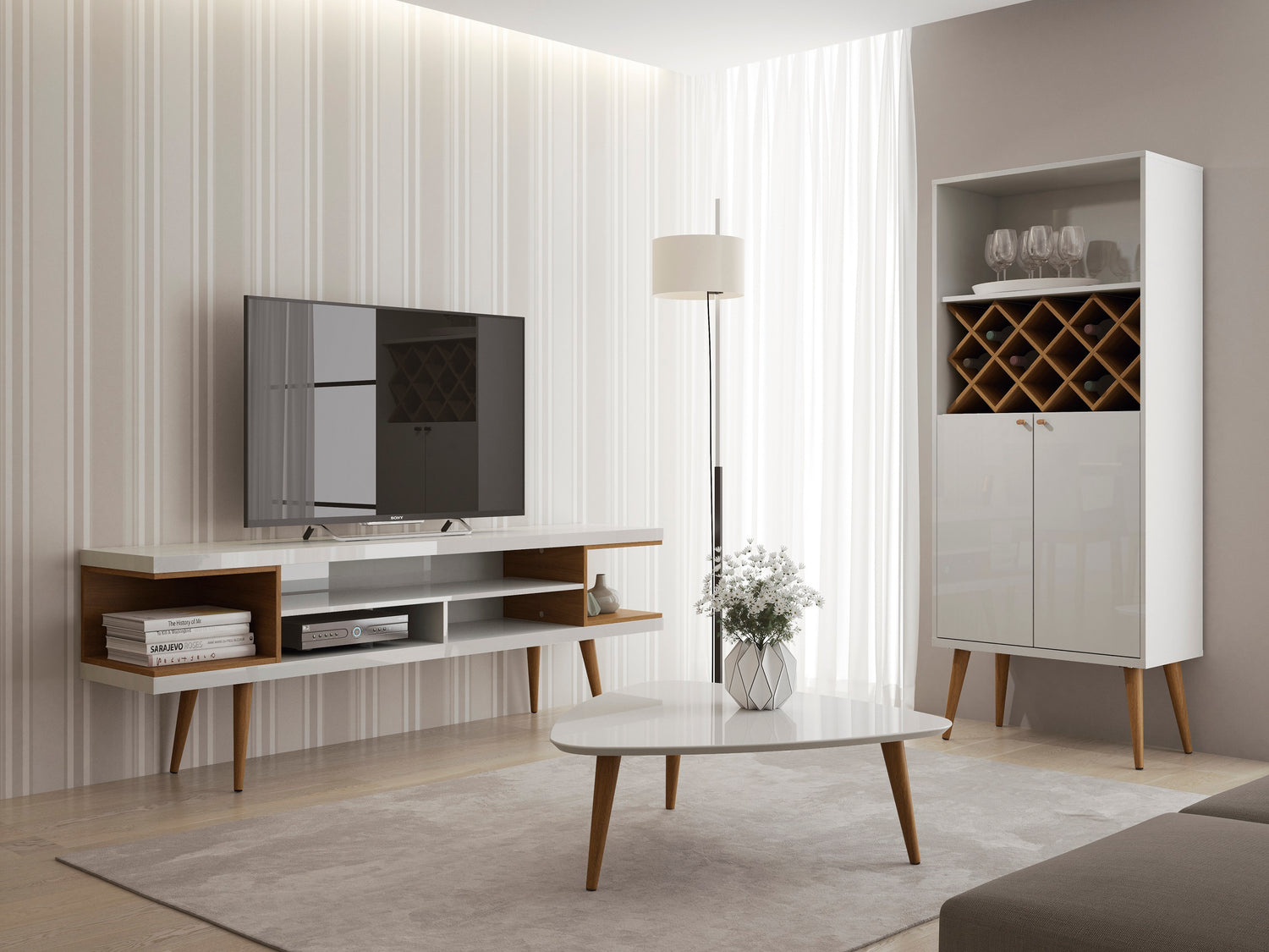 The Utopia 70.47 TV Stand melds quality craftsmanship, brilliant design, and modern functionality to create a seamlessly streamlined, and free standing entertainment center. Statement legs and corner open storage sections bring character to a space, while three airy shelves are perfect for storing all of your entertainment accessories. Available in off-white and maple cream and white gloss and maple cream.
