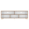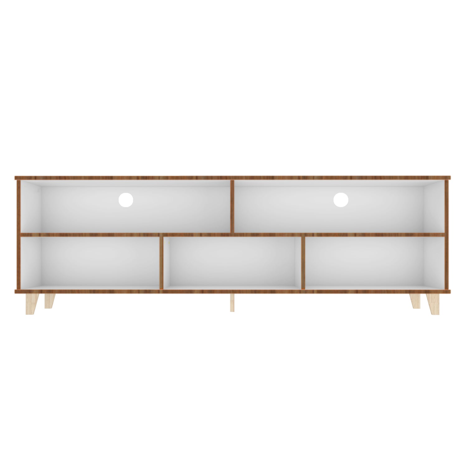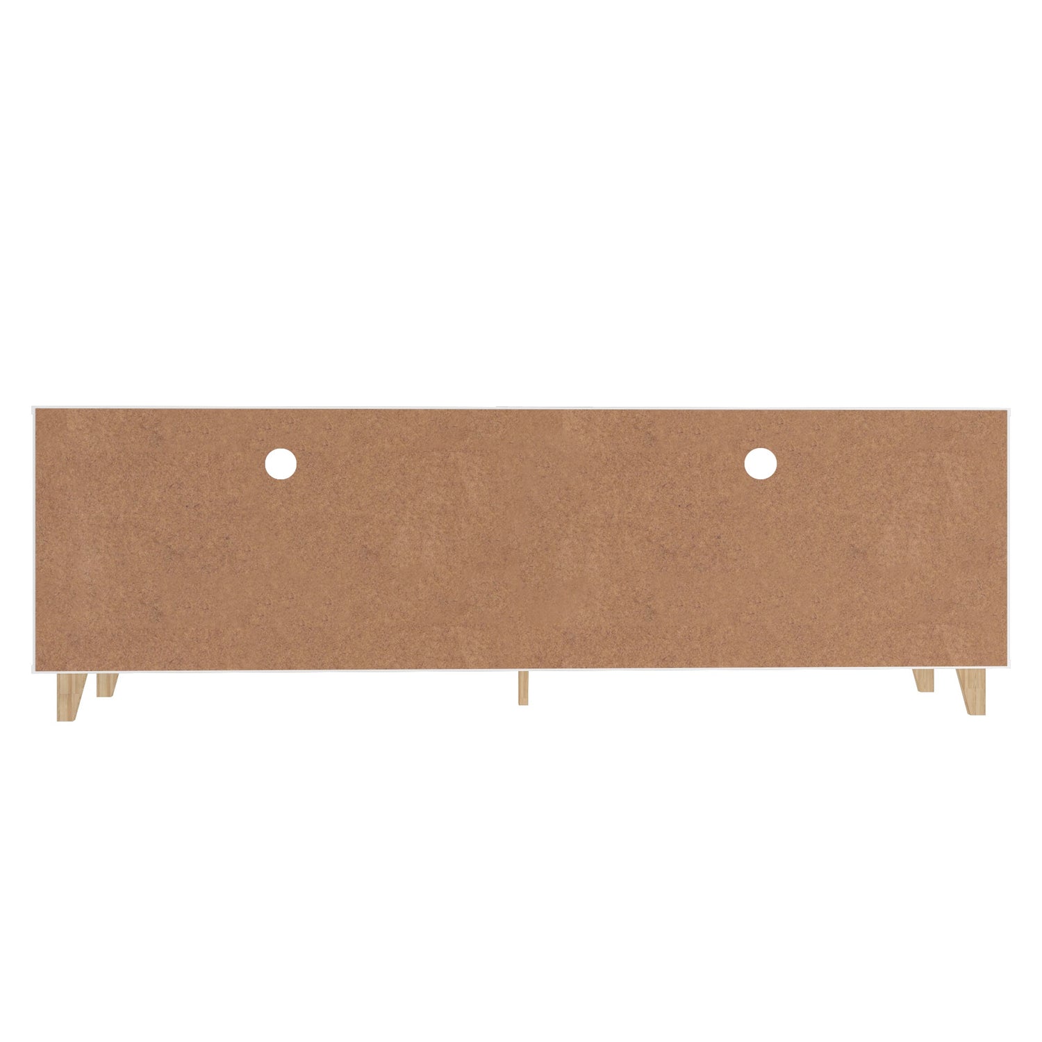 Part media center, part sideboard, part living or dining room mainstay, the Warren TV stand is as purposeful as it is beautifully crafted. Supported by splayed oak legs and made from natural pine wood with oak detailing along the open shelving, this piece instantly draws the eye in. Open airy shelving is perfect for showcasing books, dishes, media consoles, storage baskets, and a smooth top allows for displaying TV, plants, framed photos, and a bowl of popcorn for a cozy movie night in.