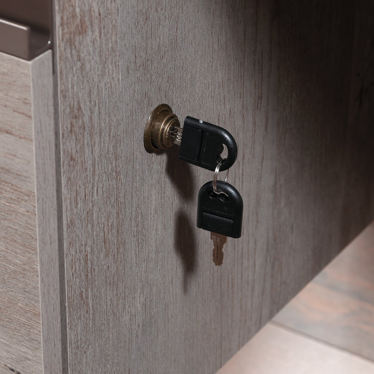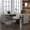Make a lasting impression in your office with this Manhattan Gate L-shaped desk. This piece features a spacious surface that's ideal for a desktop or laptop computer, books and binders, as well as a lamp and other home decor. Two drawers keep office essentials close at hand, while the bottom drawer holds letter-size hanging files for maximum organization of your documents. Plus, the file drawer has a lock to keep your important papers secure. Finished in a dapper grey tone with a powder-coated metal frame, this desk upgrades your office with simple but elegant design.