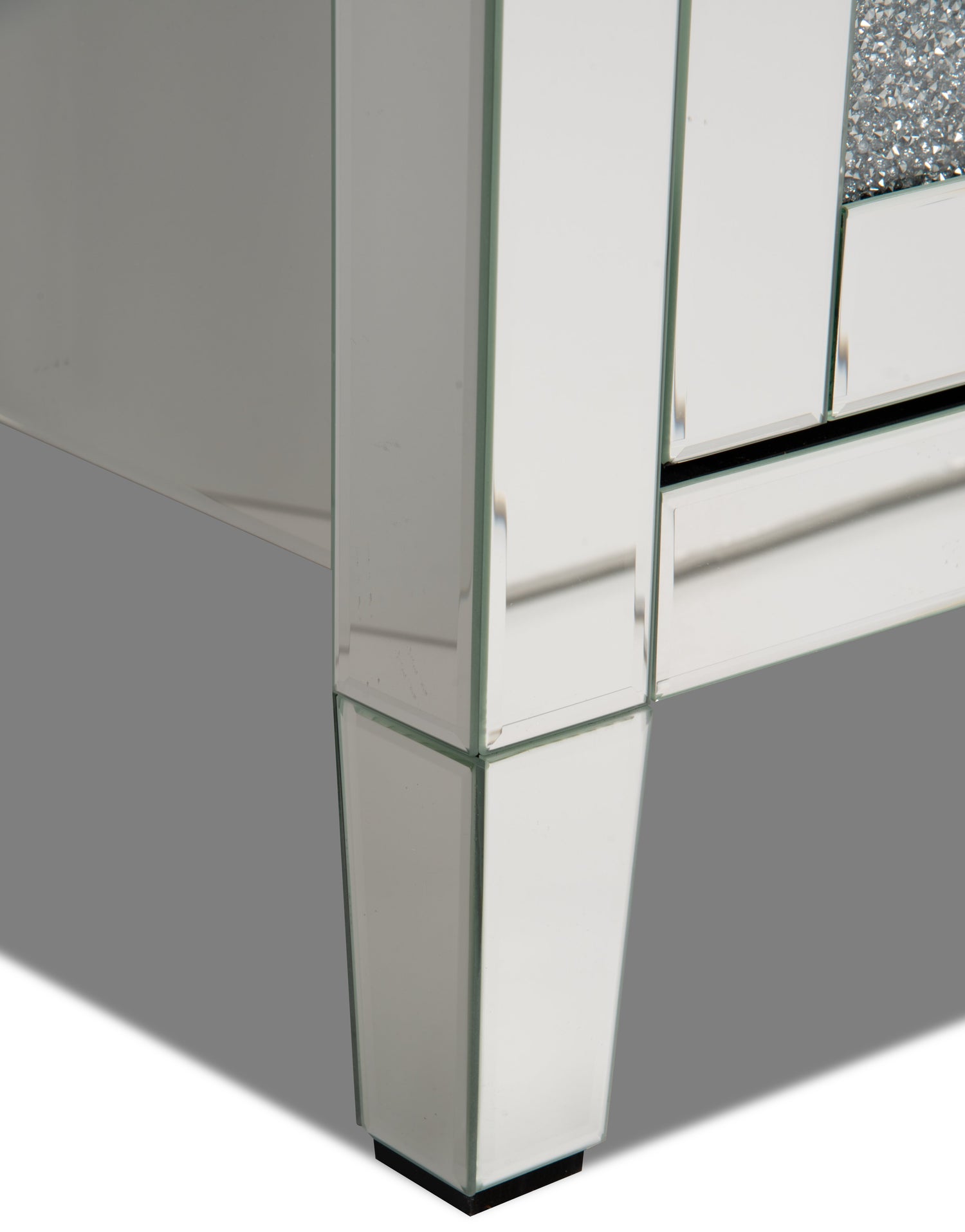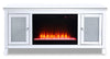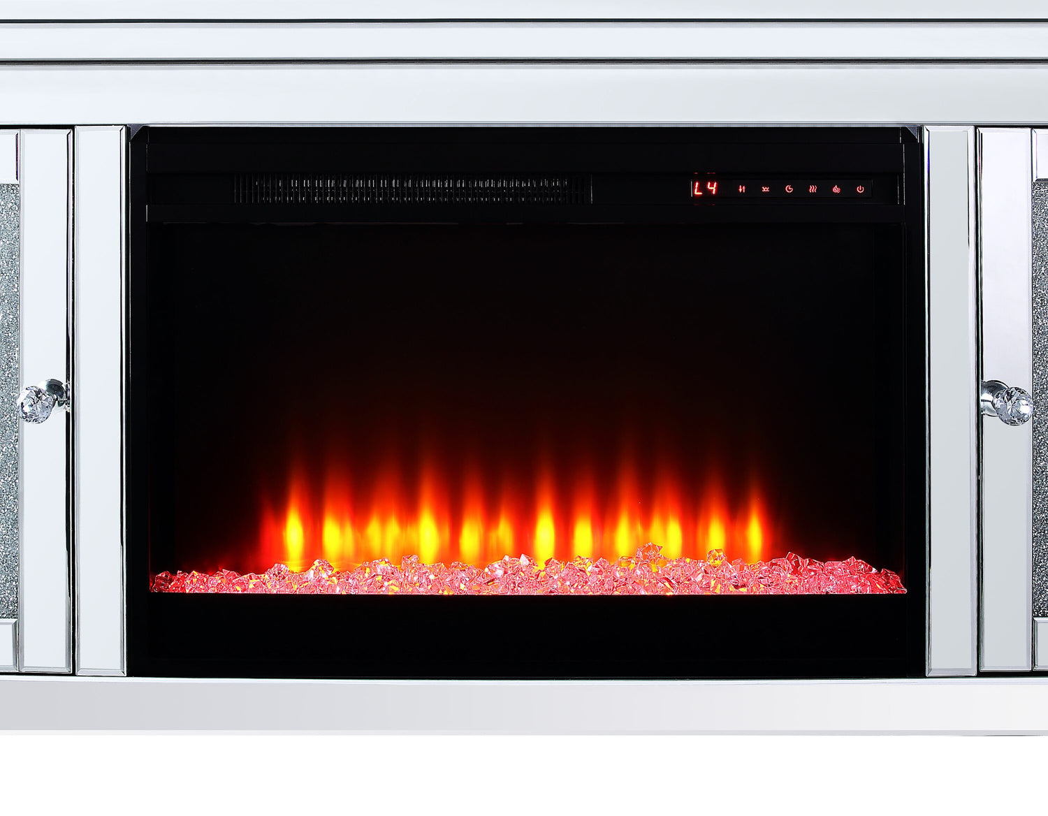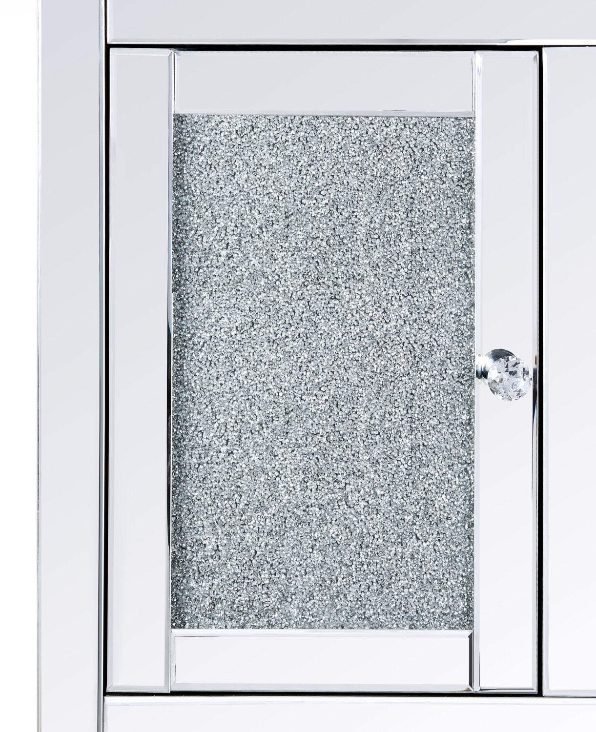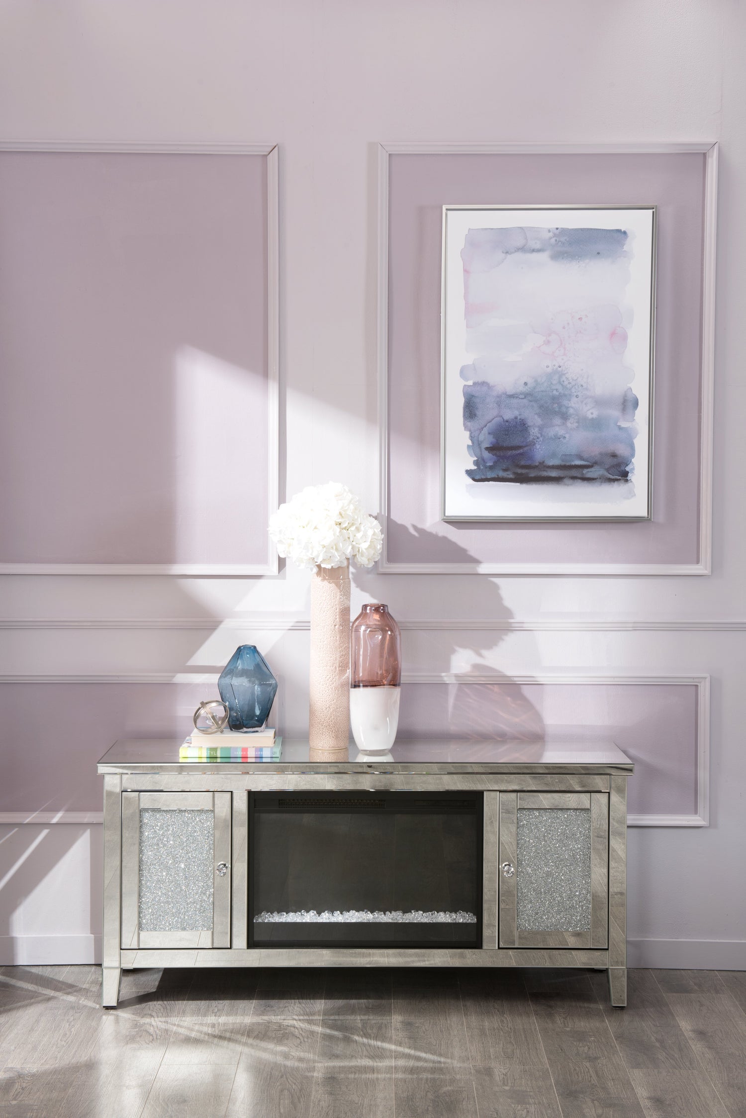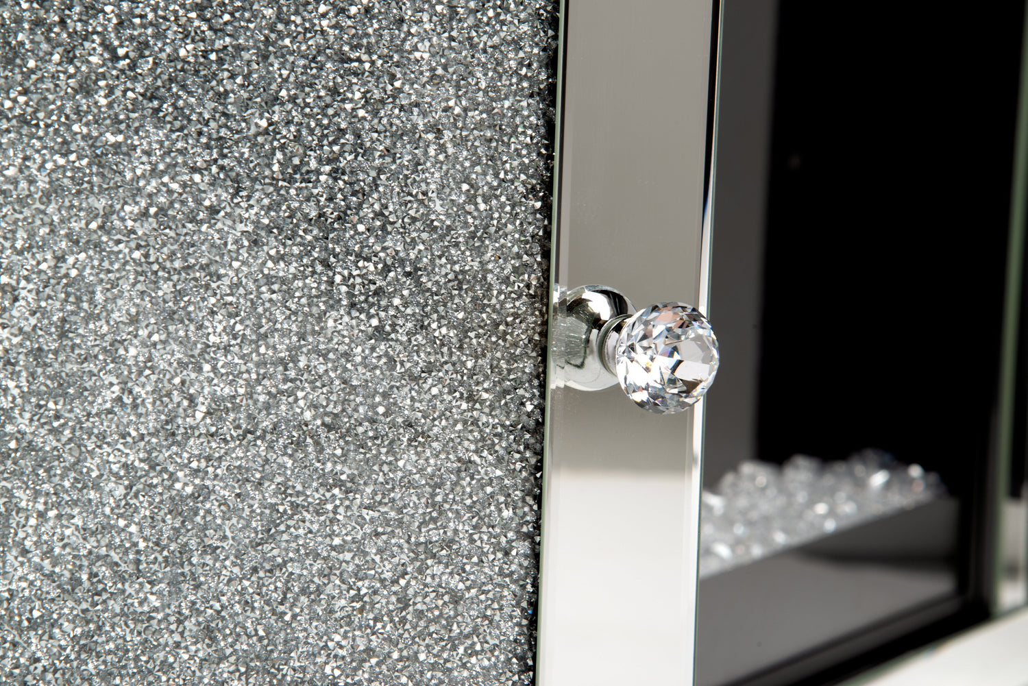 Add some dazzle to your living space with this glam Margo electric fireplace. Glittering and gleaming, this fireplace sparkles from top to bottom thanks to silver glass mirrors and diamond-like accents. With its built-in design, you can place this fireplace in a bedroom, living room or any room that needs some extra shine. Plus, it's great for heating small spaces. The shelf on top can hold your television and two cabinets reveal shelves to keep your knick-knacks out of sight. Plus, turn on this fireplace to watch it glow with the included remote control.