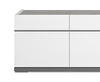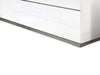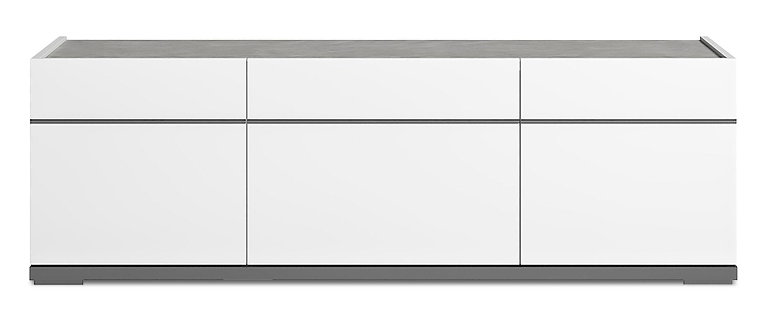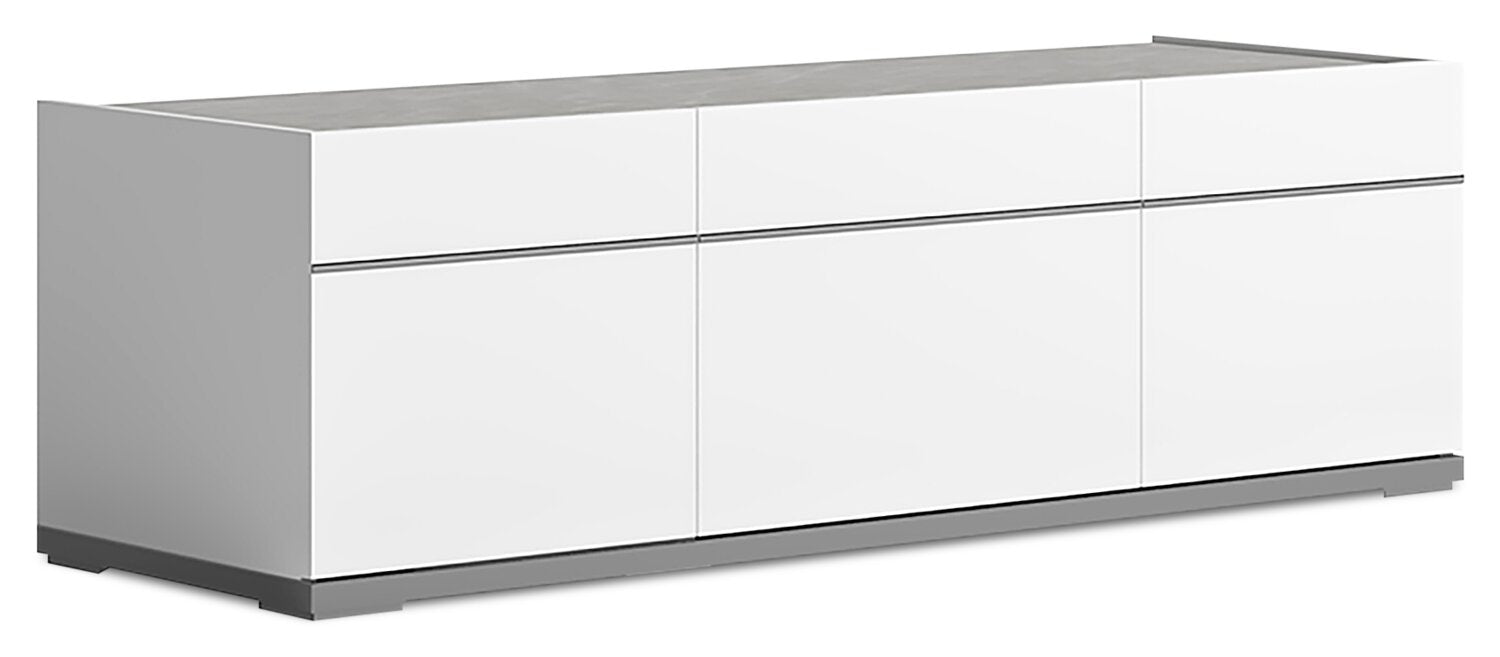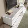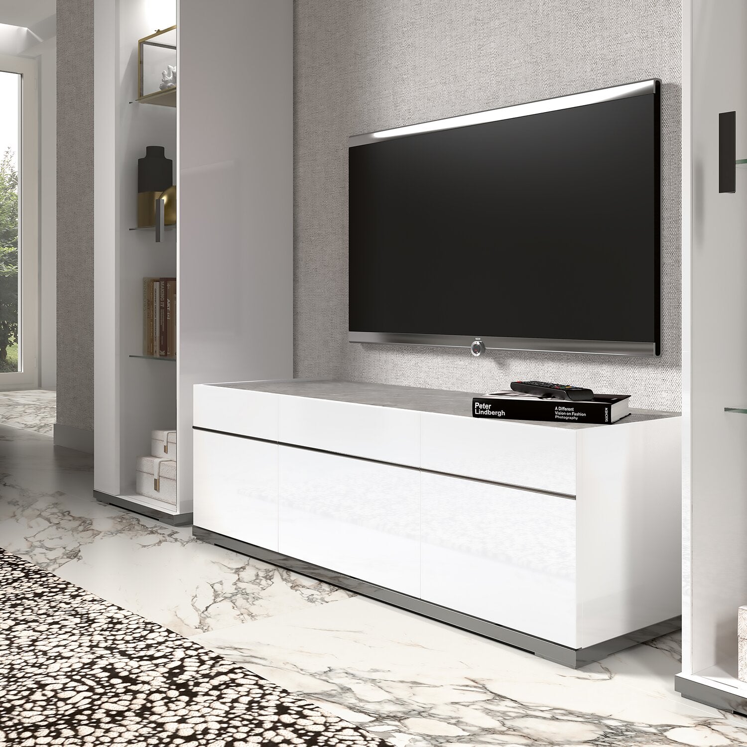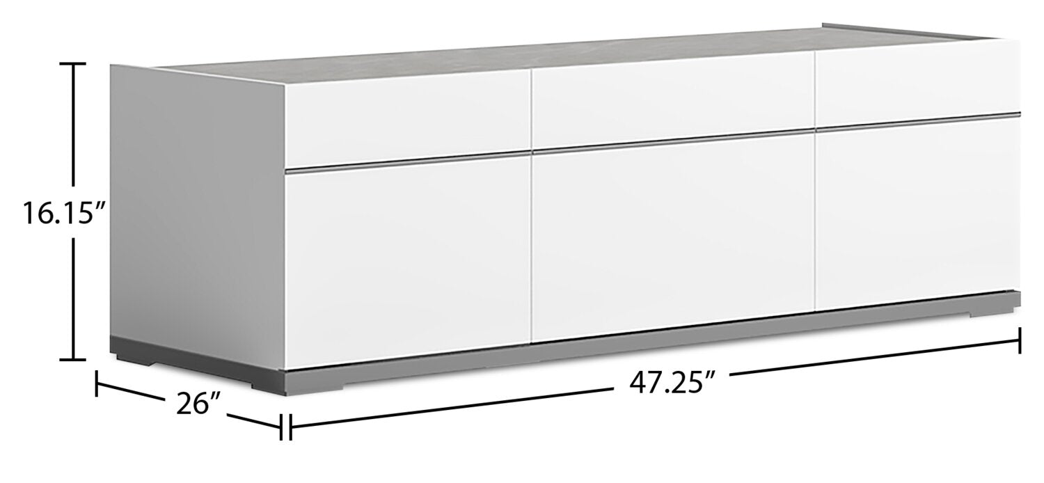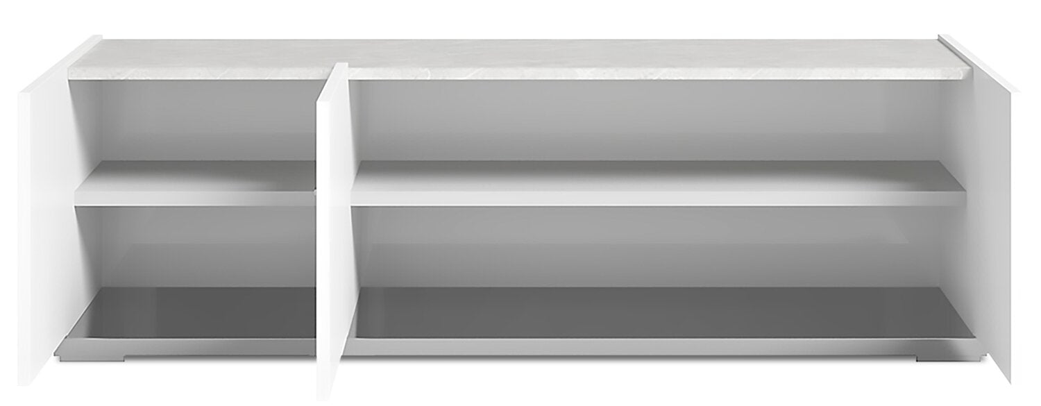 Enjoy effortless style with this contemporary Marla TV stand. Designed and produced in Italy, the stand features that signature European flair for modern and contemporary entertainment spaces. The spacious top can hold TVs up to 50 inches, while ample storage is provided behind three doors that open to two cabinets, one small and one large, each with a single fixed shelf. Boasting an exquisite acrylic lacquer finish, faux Carrera marble inlay and chrome detailing, the Marla is a perfect piece to accent your style.