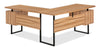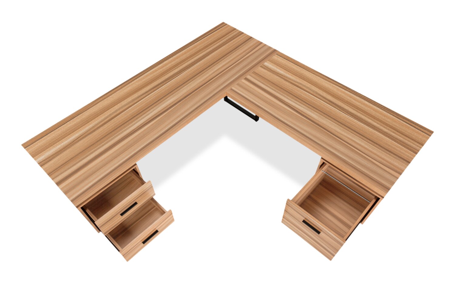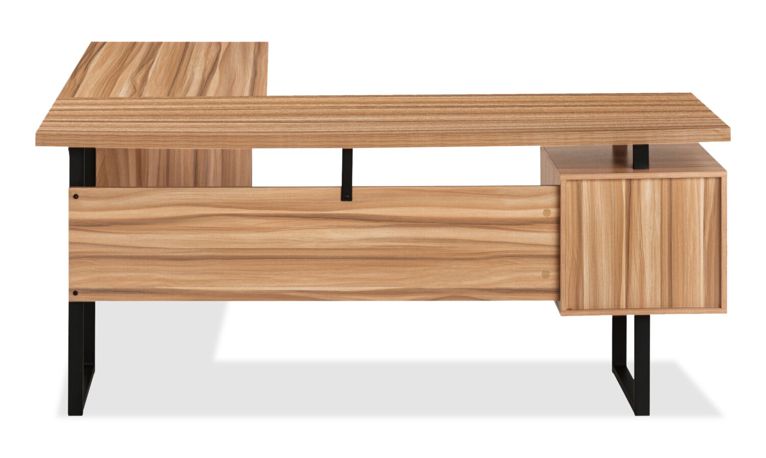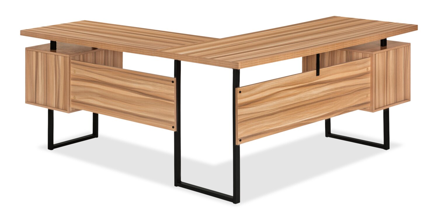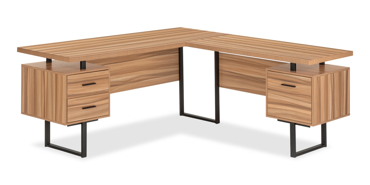 Give your office a promotion with this extra-large Marnie desk. The L-shaped, floating desktop is generously sized and leaves space to use the top of the drawer units as shelves. A reversible configuration lets you set up the desk with the drawer units on either side as desired. The space between the three storage drawers allows ample room to easily move around your workspace. Providing support are three robust metal legs that match the drawer handles. This L-shaped computer desk saves space when used in a corner but is finished on all sides for a polished look wherever it is placed in an office.