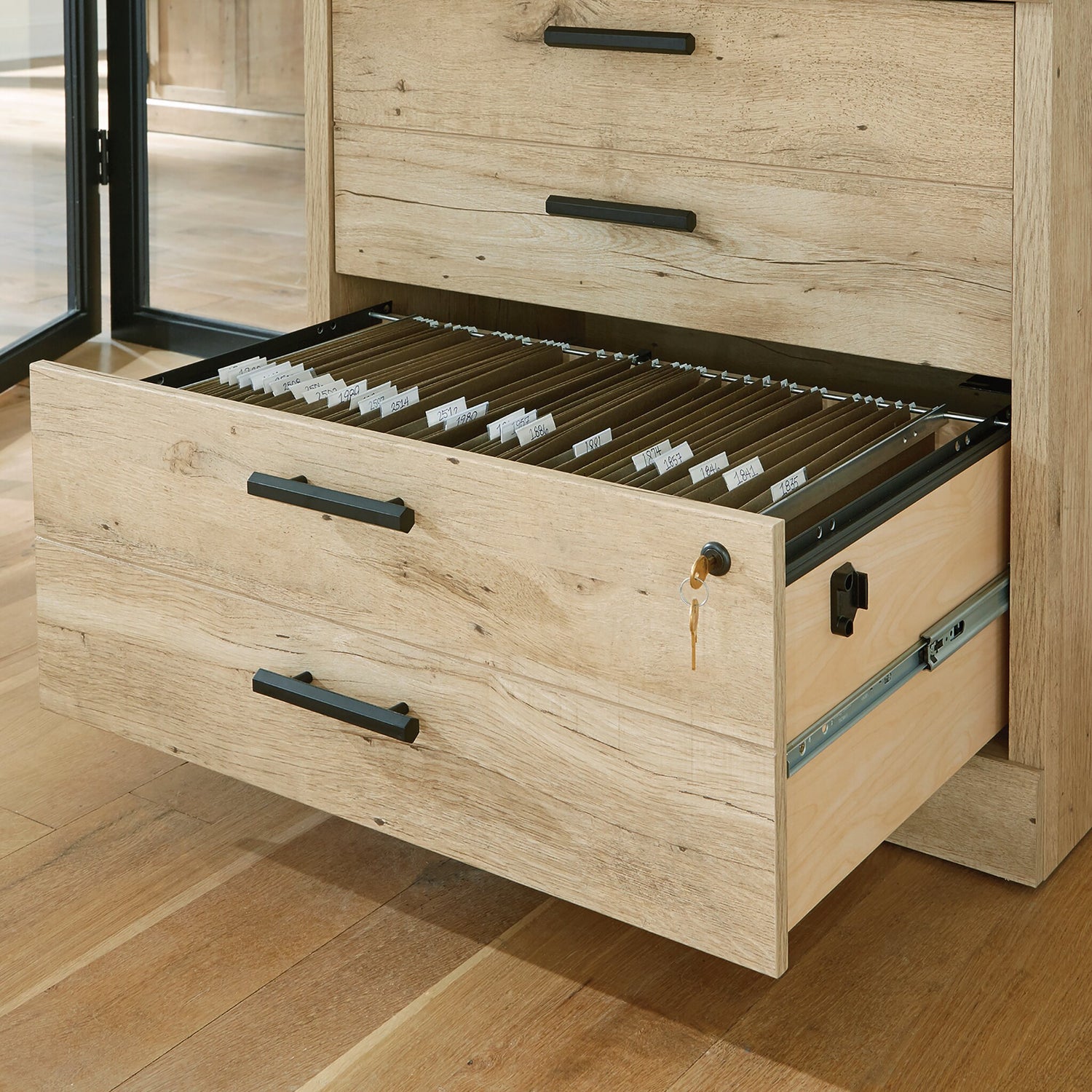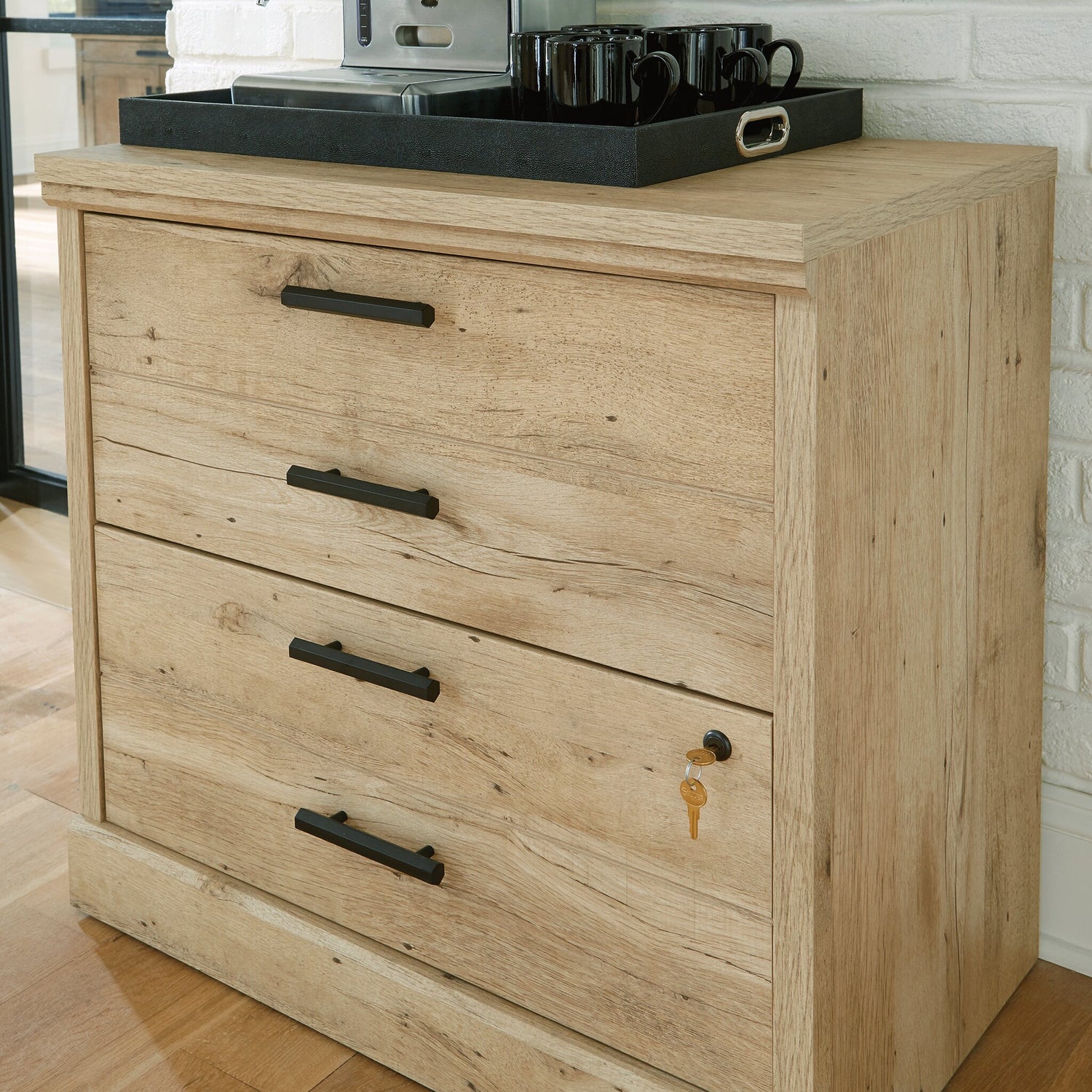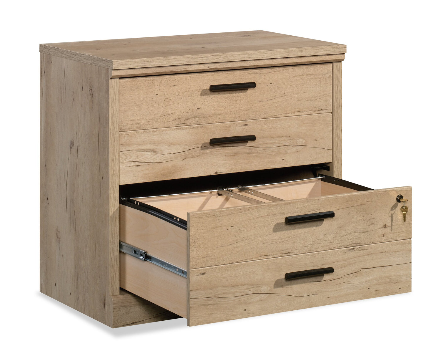 Expand storage capabilities in your office with this Mason Peak filing cabinet. With drawers that fully extend and hold letter-, legal- or European-size hanging files, all your important documents are readily available at your fingertips. Plus, your files will be secure with the drawer key locks, and the interlocking safety mechanism ensures that only one drawer can open at a time. Finished in a light, natural tone on all sides for a polished look, this cabinet seamlessly adds a touch of a modern farmhouse aesthetic to your office.