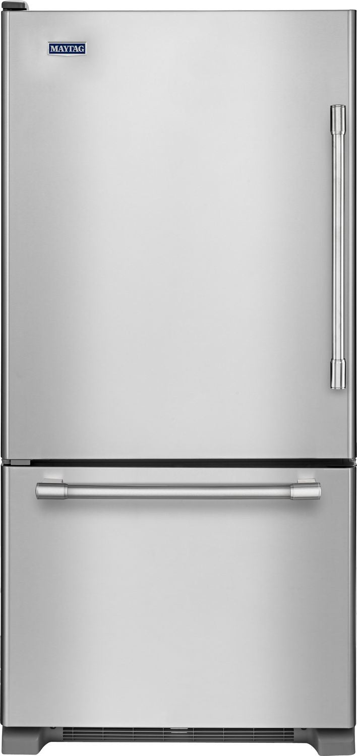 Small spaces shouldn’t mean sacrificing storage space or passing on higher-end features. This Maytag proves it: this 19-cubic-foot bottom-mount freezer refrigerator is sleek, stylish, and user-friendly. Bright LED lighting casts a more natural glow on your foods, making them look more appealing and easier to find. Stainless steel handles are durable and stylish and hold up against heavy traffic. Smart shelving adjusts and helps contain spills for quick and easy cleanup; these glass Spill-Catcher™ shelves feature sealed edges and select shelves slide out for convenience.