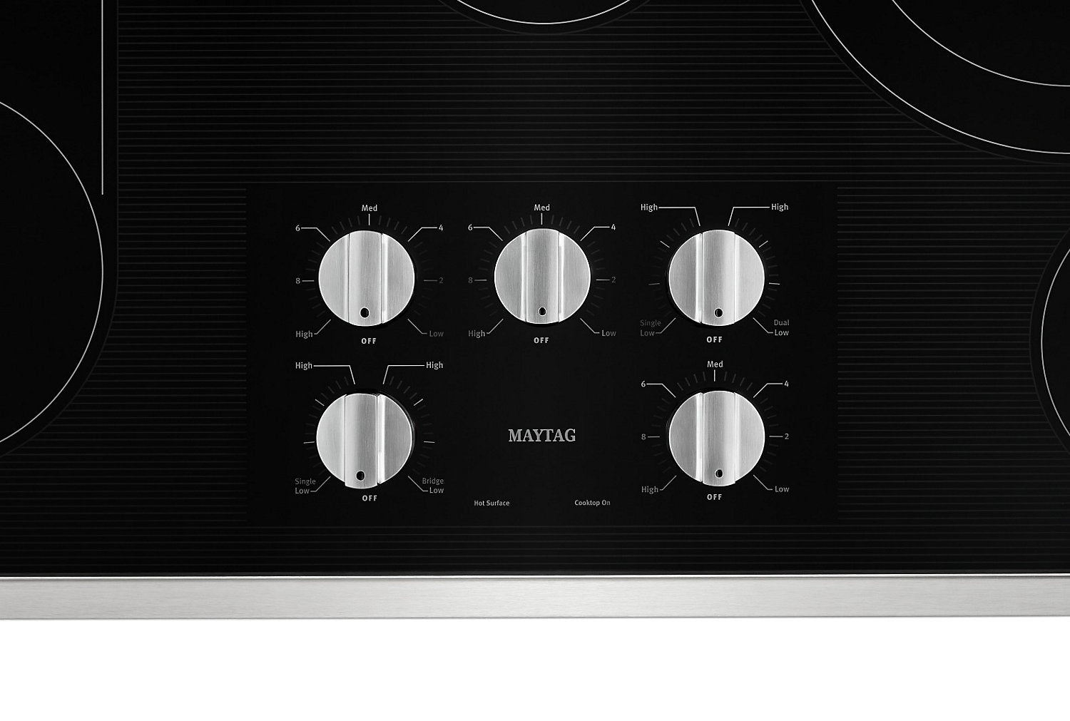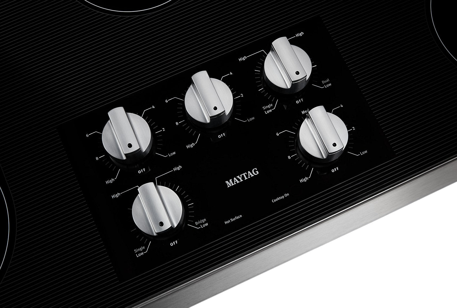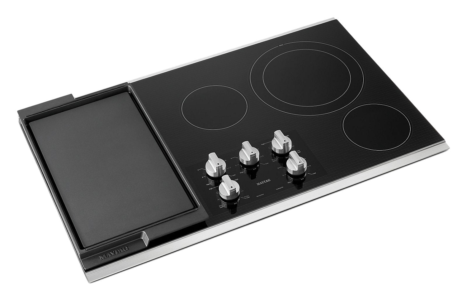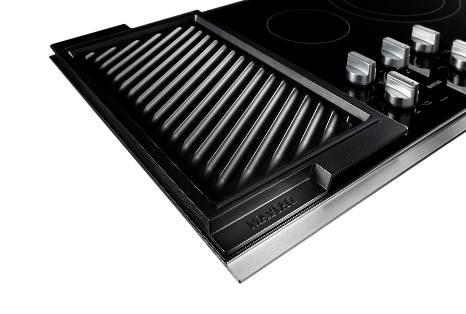 You're in control with the Maytag exclusive electric cooktop with reversible grill and griddle. Sizzle food using your regular pans on one of the four powerful elements, or whip up delicious paninis or grilled veggies on the included reversible grill and griddle. Powerful when and where you need it, simply fire up the variable-sized Dual-Choice™ element and select the most efficient size for your pots and pans, or link the bridge element for large casserole dishes. Finally, heavy-duty knobs add an elegant touch to your countertop while also lasting for years.