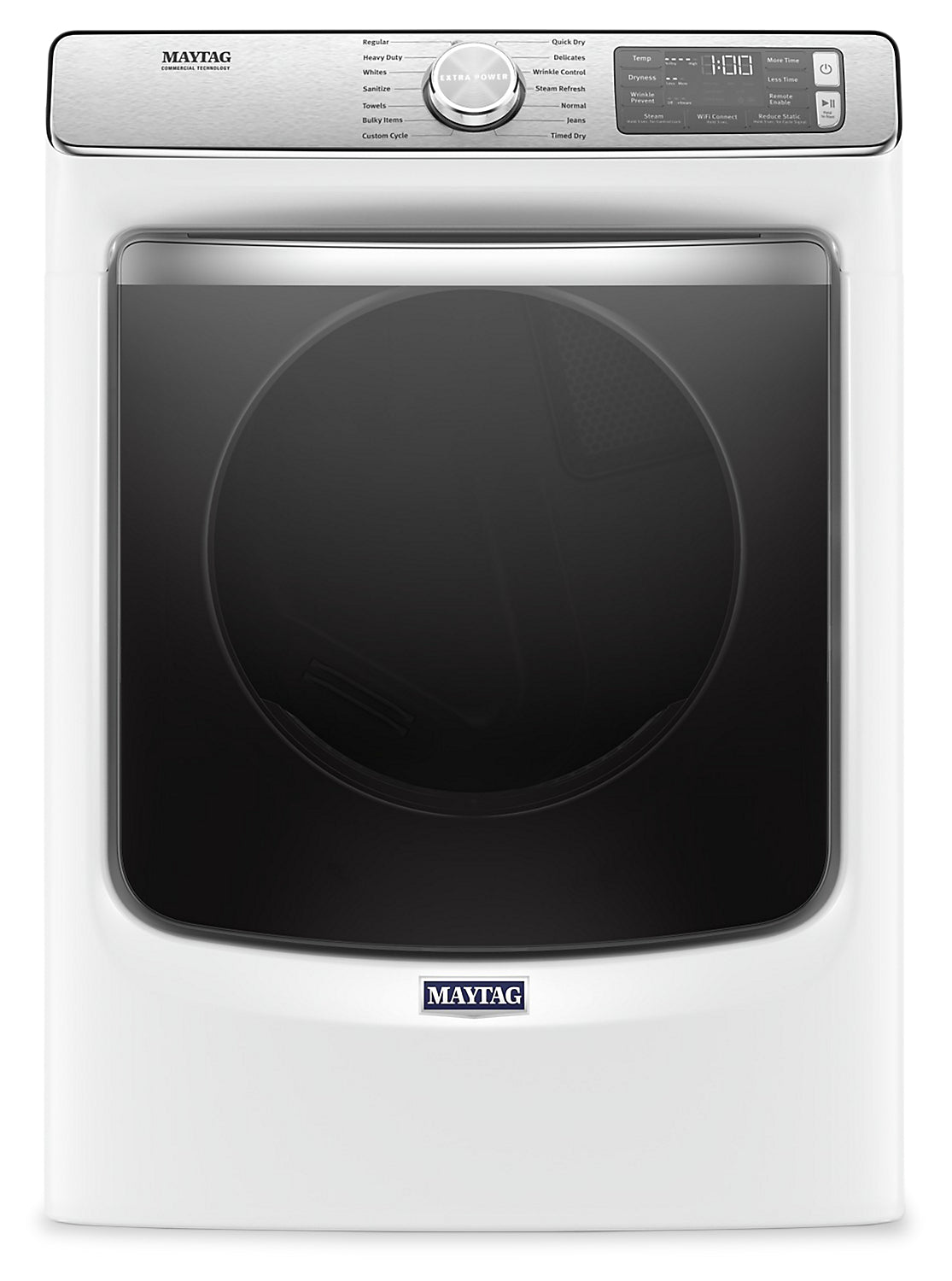 When heavy jeans and large blankets are in the dryer, push the Extra Power button on Maytag’s electric dryer to help get thick fabrics, pockets, hems and seams dry the first time. Advanced Moisture Sensing monitors inside moisture and air temperatures to help evenly and completely dry heavy loads. Dry a small load fast with the Quick Dry cycle, which pairs nicely with the Quick Wash cycle on select Maytag washers. Choose steam-enhanced cycles and options to help prevent wrinkles, refresh clothes and reduce static.