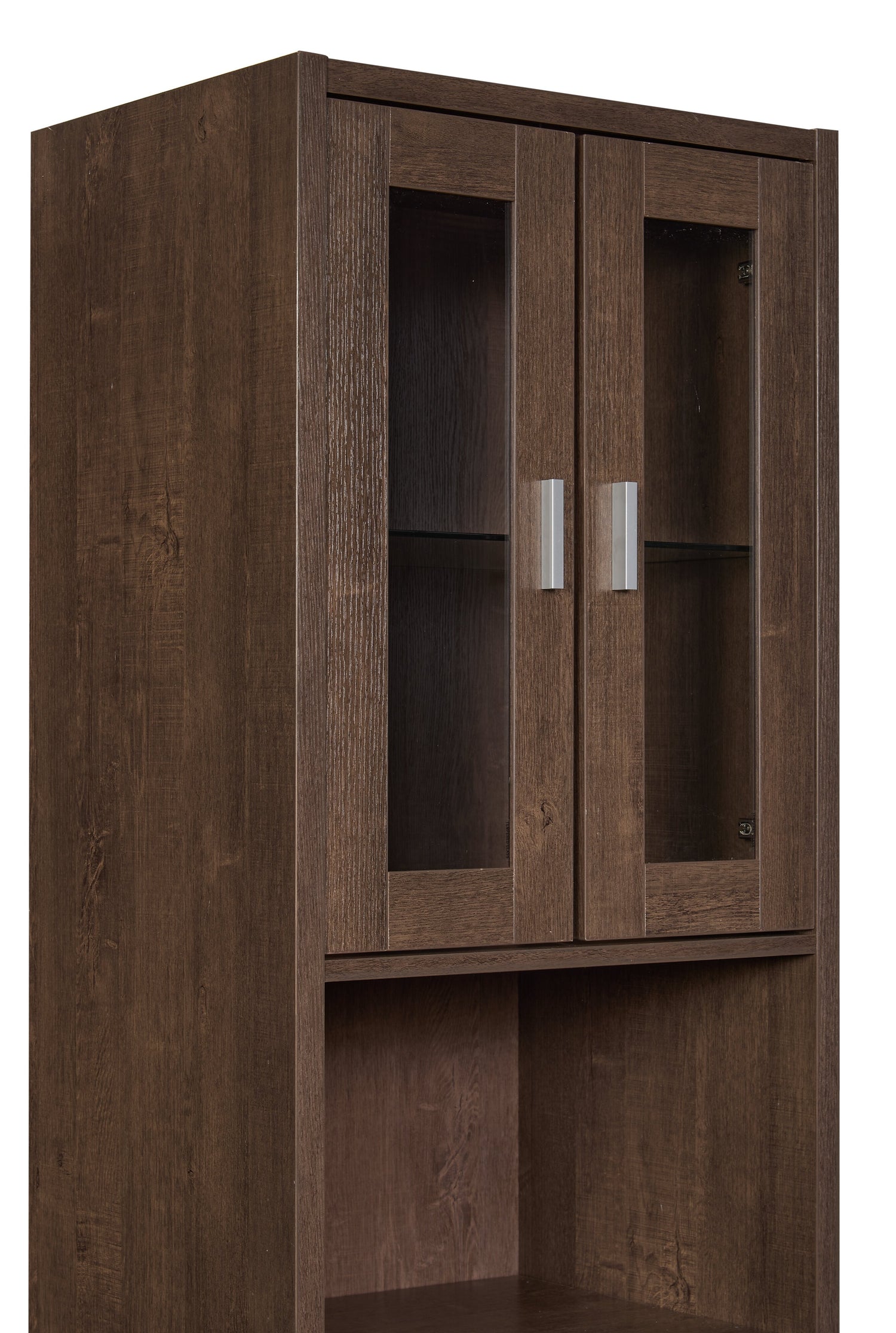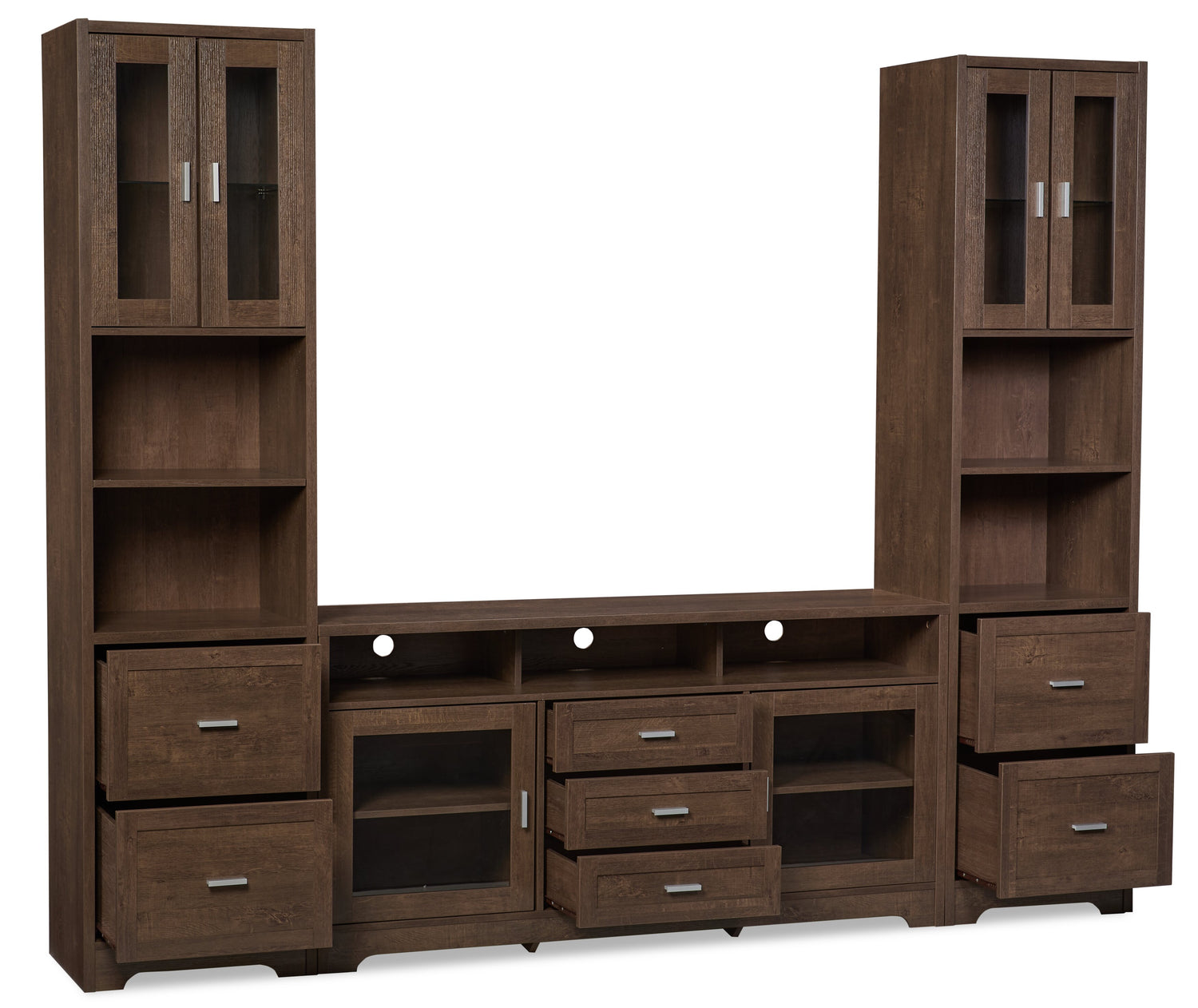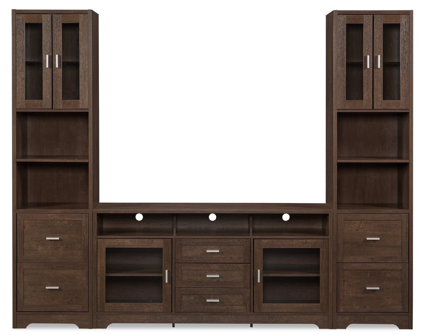 | Storage Options | Three cubbies; two cabinets with glass front doors and adjustable shelves; three drawers with metal drawer glides. |