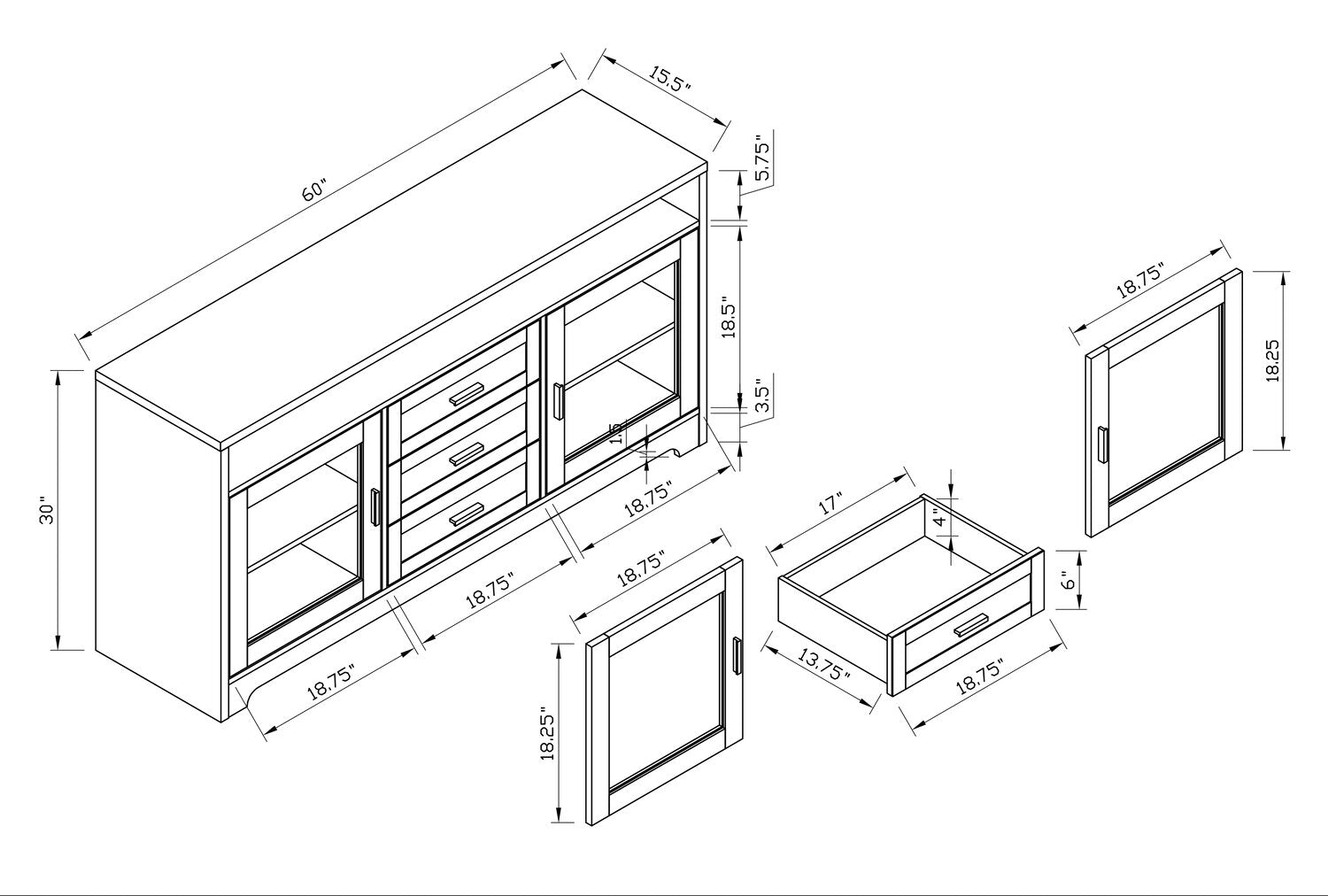 | This Product Includes | Top and bottom panels, middle shelves, side and back panels, front and back slats, middle divider panels, door frame, drawers and all hardware. |