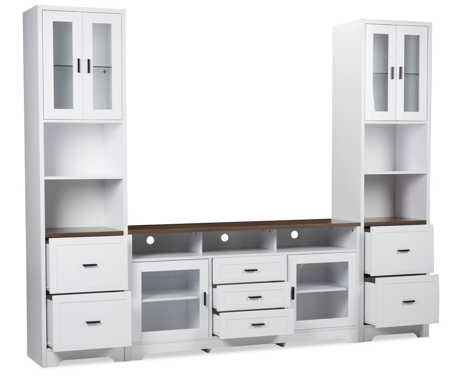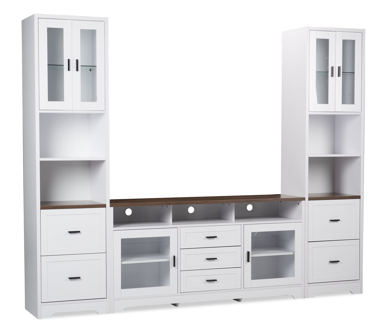 | Storage Options | Three cubbies; two cabinets with glass front doors and adjustable shelves; three drawers with metal drawer glides. |