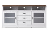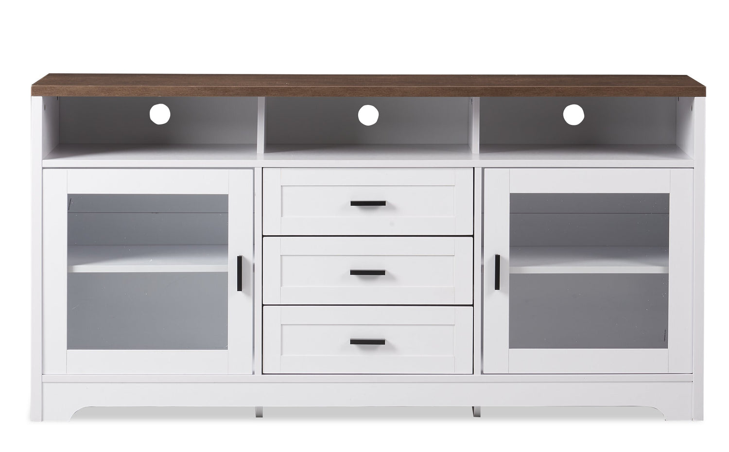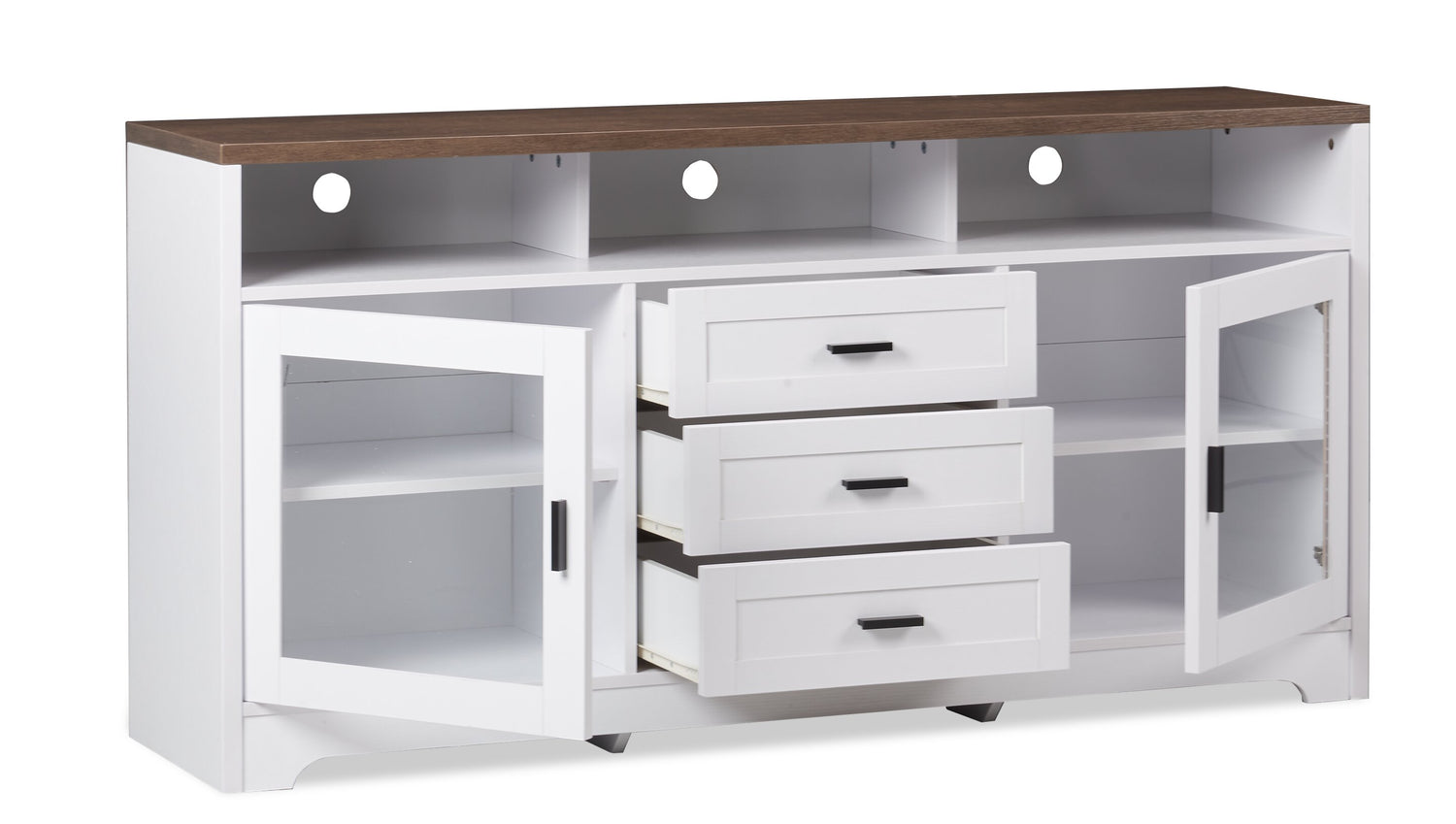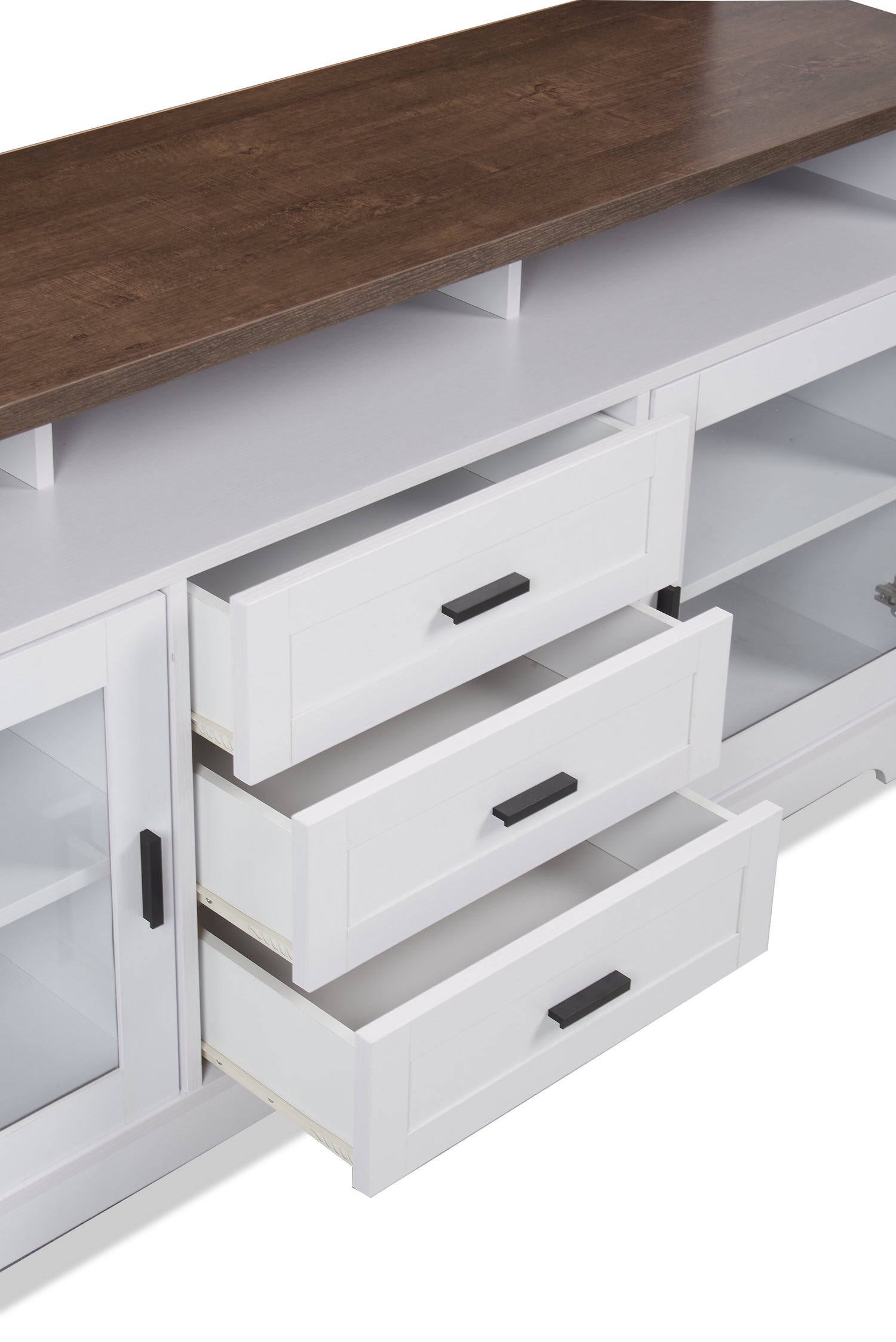 | Storage Options | Three cubbies; two cabinets with glass front doors and adjustable shelves; three drawers with metal drawer glides. |