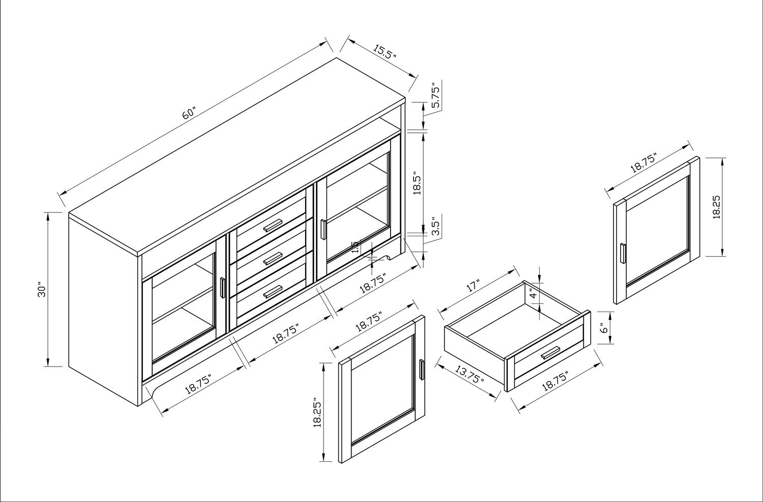 | This Product Includes | Top and bottom panels, middle shelves, side and back panels, front and back slats, middle divider panels, door frame, drawers and all hardware. |