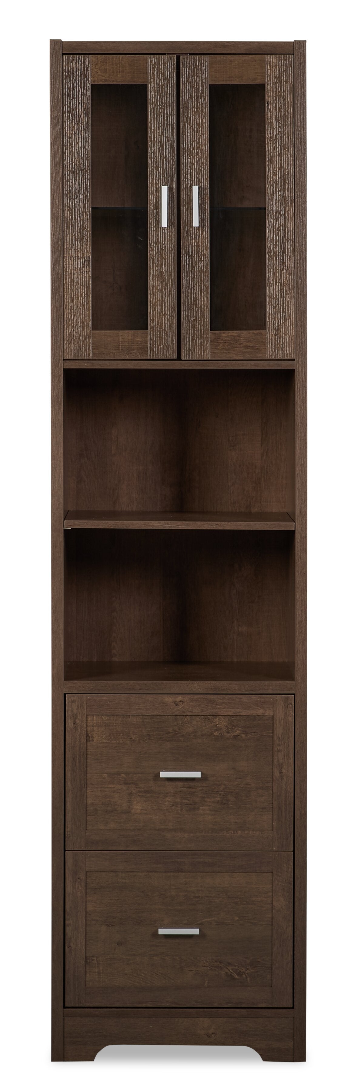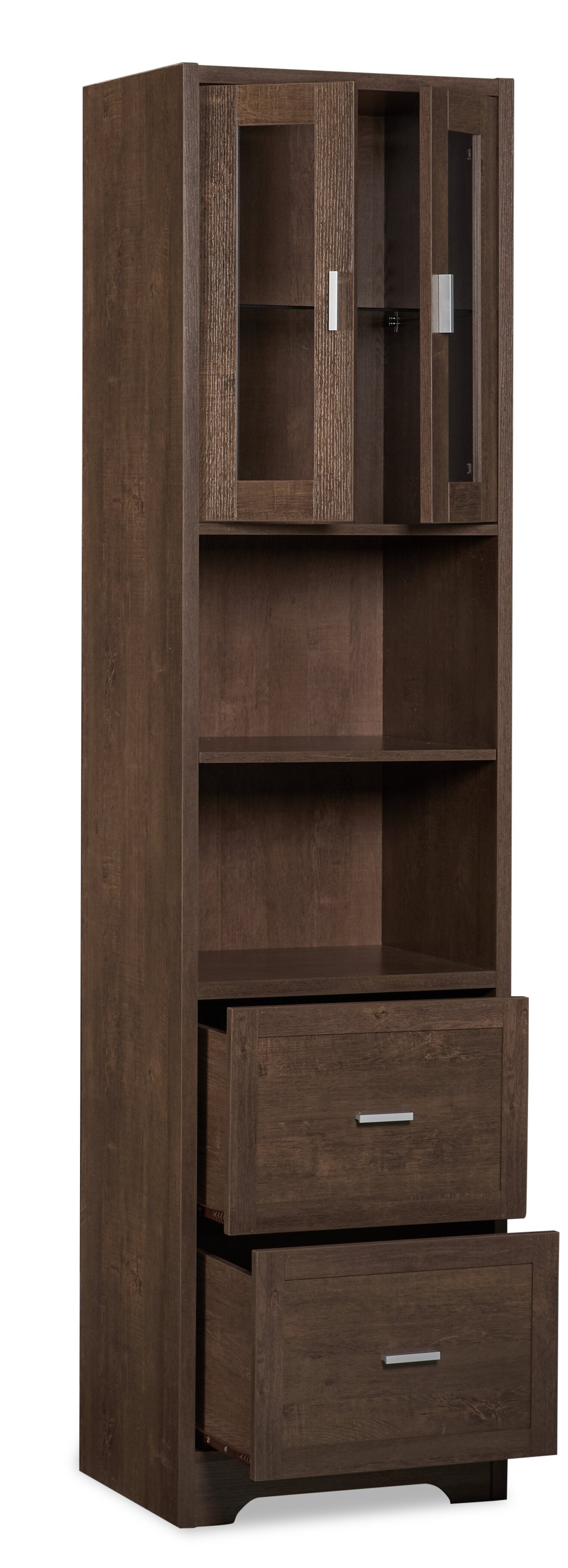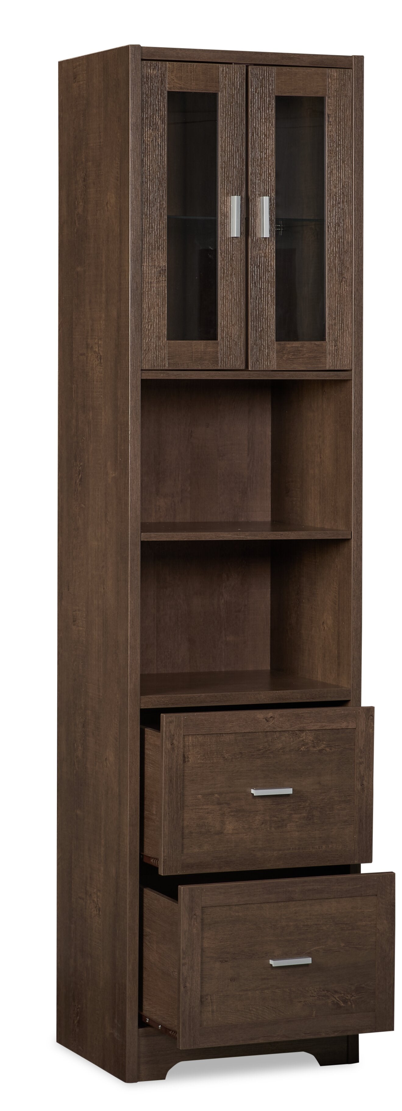 | Storage Options | Two cubbies with an adjustable shelf; one cabinet with a glass front door; two drawers with metal drawer glides. |