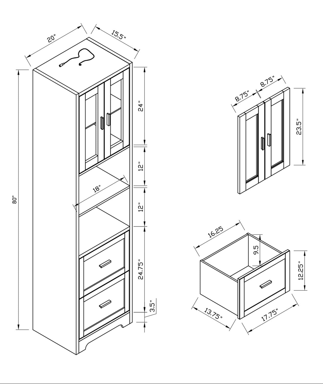 Width: 20" (50.8 cm) Height: 80" (203.2 cm) Depth: 15.5" (39.4 cm)