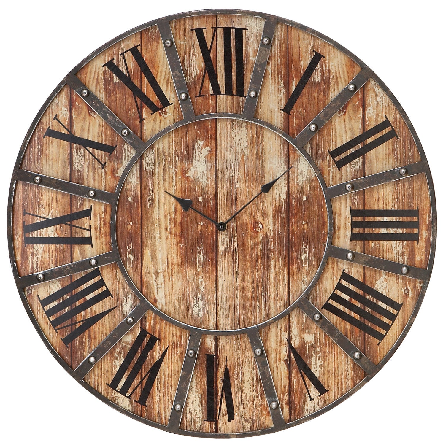 Rustic and romantic, this metal and wood wall clock makes a welcoming addition to any wall. Crafted from solid wood with a black, distressed metal casing to separate the hours, this large clock is a powerful statement piece. Large contrasting roman numerals are easy to read from across the room and round out the vintage feel of this piece.