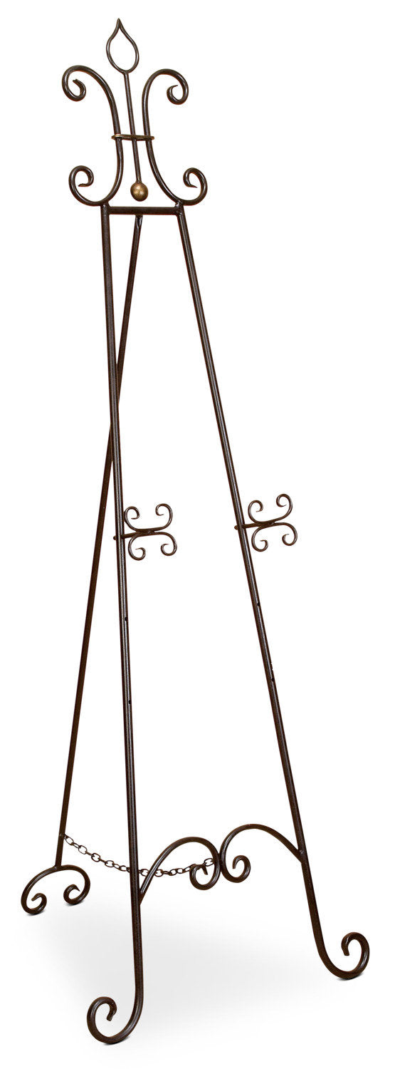 Proudly display your works of art or treasured family photo with this elegant metal adjustable easel. The holding brackets can be moved higher or lower to display different sized artwork and a safety chain makes sure your valuable paintings don’t fall if bumped. Metal scrollwork decorates the simple, dark brown frame, letting your display piece be the centre of attention.
