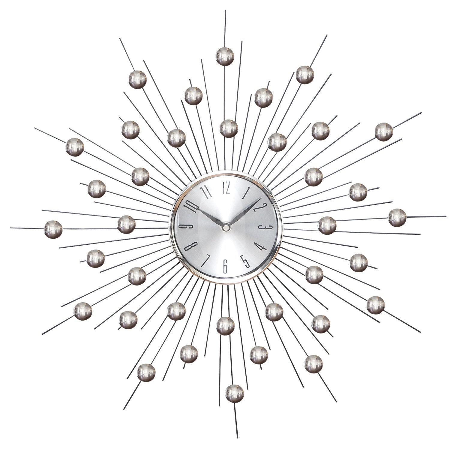 For a sophisticated yet functional piece of wall art this celestial metal wall clock is everything you’d want. Classically cool with large, easy-to-read numbers, this starburst clock features slick silver styling and simple numerals for a bold statement piece. Like stars around the moon, small silver balls orbit the clock, suspended from thin black rods that shoot forth from the centre. Perfectly at home in a retro loft or a sleek modern studio, this glittering statement piece does so much more than tell time.