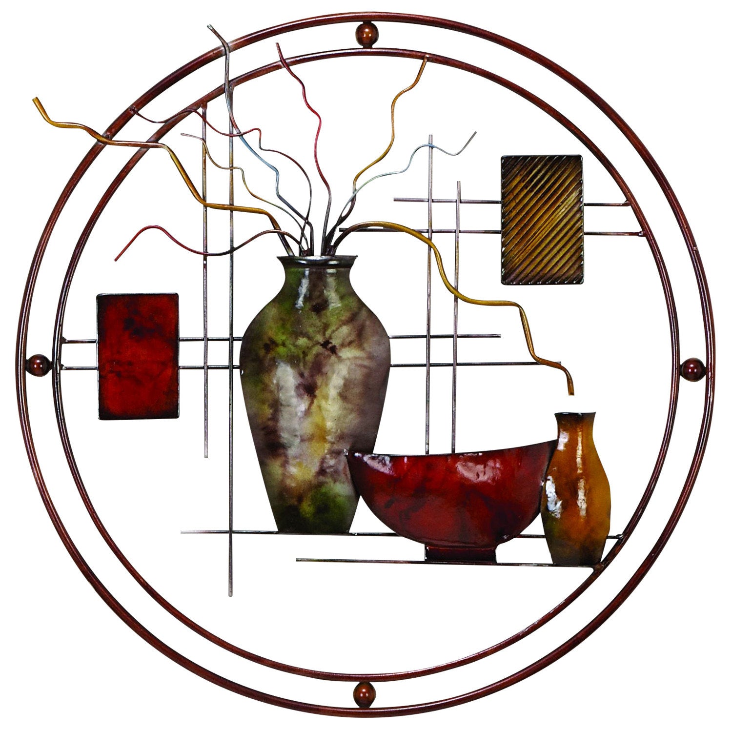 With its abstract mix of colours and textures, this unique, still-life metal wall decor brings a sense of fun to your home. Geometric lines run vertically and horizontally, contrasting with the circular frame for an interesting piece of art. Soft, muddled earth tones and a high-sheen finish make this piece the focal point of any room.
