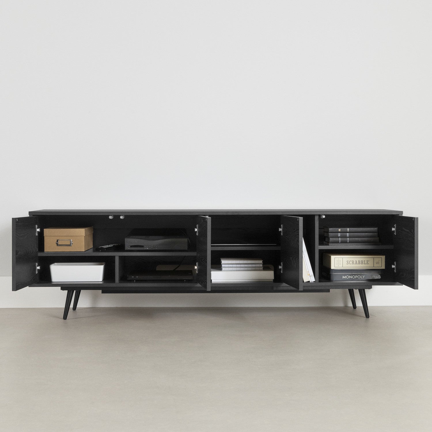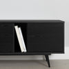 This TV stand redefines any living space with its modern look and clean lines. Standing of sleek metal legs and stretching 71 inches in width, it introduces an air of lightness and elegance. Its unique push-to-open system eliminates the need for traditional handles, resulting in an even more minimalist aesthetic that’s sure to catch the eye. Designed to simplify your life, this piece solves the puzzle of messy cables with its cable management hole accessible from two compartments. The two adjustable shelves, ample closed storage space and vertical open storage area ensure everything from your devices to books or vinyl collection is within easy reach. Plus, it’s sturdy enough to hold a television up to 75 inches!